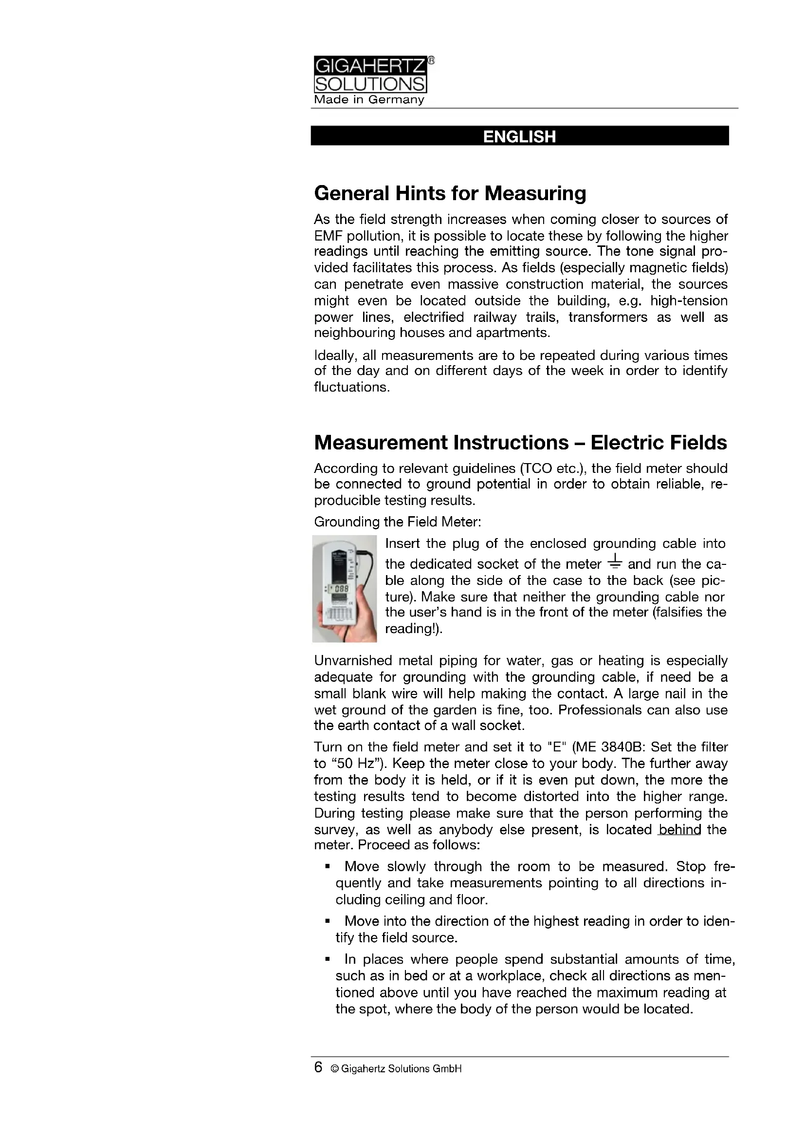 Battery, Auto-Power-Off, Low batt. The meter is powered by a 9 V battery, situated in the battery compartment on the back of the meter. The meter will automatically be shut off after 40 minutes of con- tinuous use in order to save battery capacity. When “Low. Batt.” appears in the centre of the display, the field meter will be turned off after 3 min. in order to avoid measurement errors. Possibilities of Remediation If possible, increase the distance to the source of pollution Correct “Plugging”: Switch the meter to “E” and place it between e.g. the bedside light and the pillow. Switch off light. Reverse direction of plug by 180° and re-insert it. Logical: leave plug in the direction of lowest readings. This trick works best for an inline cable-switch of e.g. the lamp. Use shielded socket-lines with two pole switch and shielded con- nection cables (for available versions check our website). Install an automated “demand switch” in the house fuse box which cuts out electricity as soon as the last load is switched off and automatically reconnects as soon as electricity is needed again. As long as everything is switched off, there is no tension on the line and hence no pollution in the room. This is the most com- fortable and effective measure you can take. Check www.gigahertz-solutions.com for most sophisticated and well reputed models.Made in Germany 10 © Gigahertz Solutions GmbH It's easy to check for yourself whether a demand switch is a good investment for you (easiest in pairs): One person reads the meter on the bed to be inspected. Switch the meter to “E“. The other person switches off the relevant fuses (one by one and different combinations) Install the demand switch into those circuits which show the highest reduction of field strength. Further hints, literature and contact information regarding professional “building biologists” can be found on our web- site.Made in Germany © Gigahertz Solutions GmbH 11 Italiano