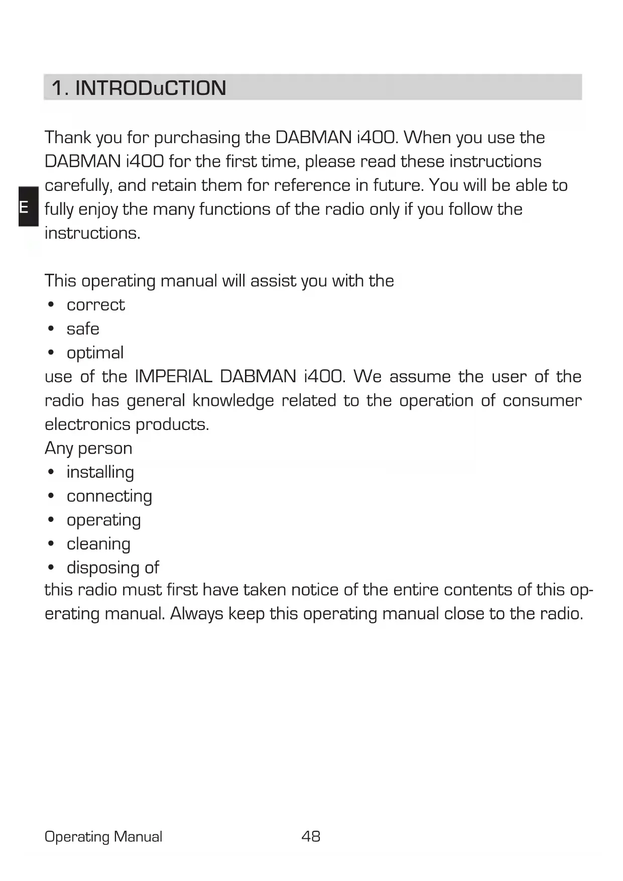 - optimal use of the IMPERIAL DABMAN i400. We assume the user of the radio has general knowledge related to the operation of consumer electronics products. Any person