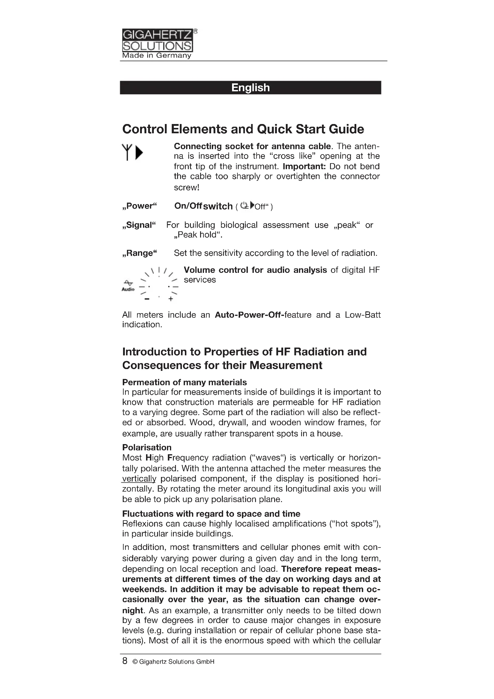 English Control Elements and Quick Start Guide Connecting socket for antenna cable. The anten- na is inserted into the “cross like” opening at the front tip of the instrument. Important: Do not bend the cable too sharply or overtighten the connector screw! „Power“ On/Off switch ( = ”Off“ ) „Signal“ For building biological assessment use „peak“ or „Peak hold“. „Range“ Set the sensitivity according to the level of radiation. Volume control for audio analysis of digital HF services All meters include an Auto-Power-Off-feature and a Low-Batt indication. Introduction to Properties of HF Radiation and Consequences for their Measurement Permeation of many materials In particular for measurements inside of buildings it is important to know that construction materials are permeable for HF radiation to a varying degree. Some part of the radiation will also be reflect- ed or absorbed. Wood, drywall, and wooden window frames, for example, are usually rather transparent spots in a house. Polarisation Most High Frequency radiation (“waves“) is vertically or horizon- tally polarised. With the antenna attached the meter measures the vertically polarised component, if the display is positioned hori- zontally. By rotating the meter around its longitudinal axis you will be able to pick up any polarisation plane. Fluctuations with regard to space and time Reflexions can cause highly localised amplifications (“hot spots”), in particular inside buildings. In addition, most transmitters and cellular phones emit with con- siderably varying power during a given day and in the long term, depending on local reception and load. Therefore repeat meas- urements at different times of the day on working days and at weekends. In addition it may be advisable to repeat them oc- casionally over the year, as the situation can change over- night. As an example, a transmitter only needs to be tilted down by a few degrees in order to cause major changes in exposure levels (e.g. during installation or repair of cellular phone base sta- tions). Most of all it is the enormous speed with which the cellularMade in Germany