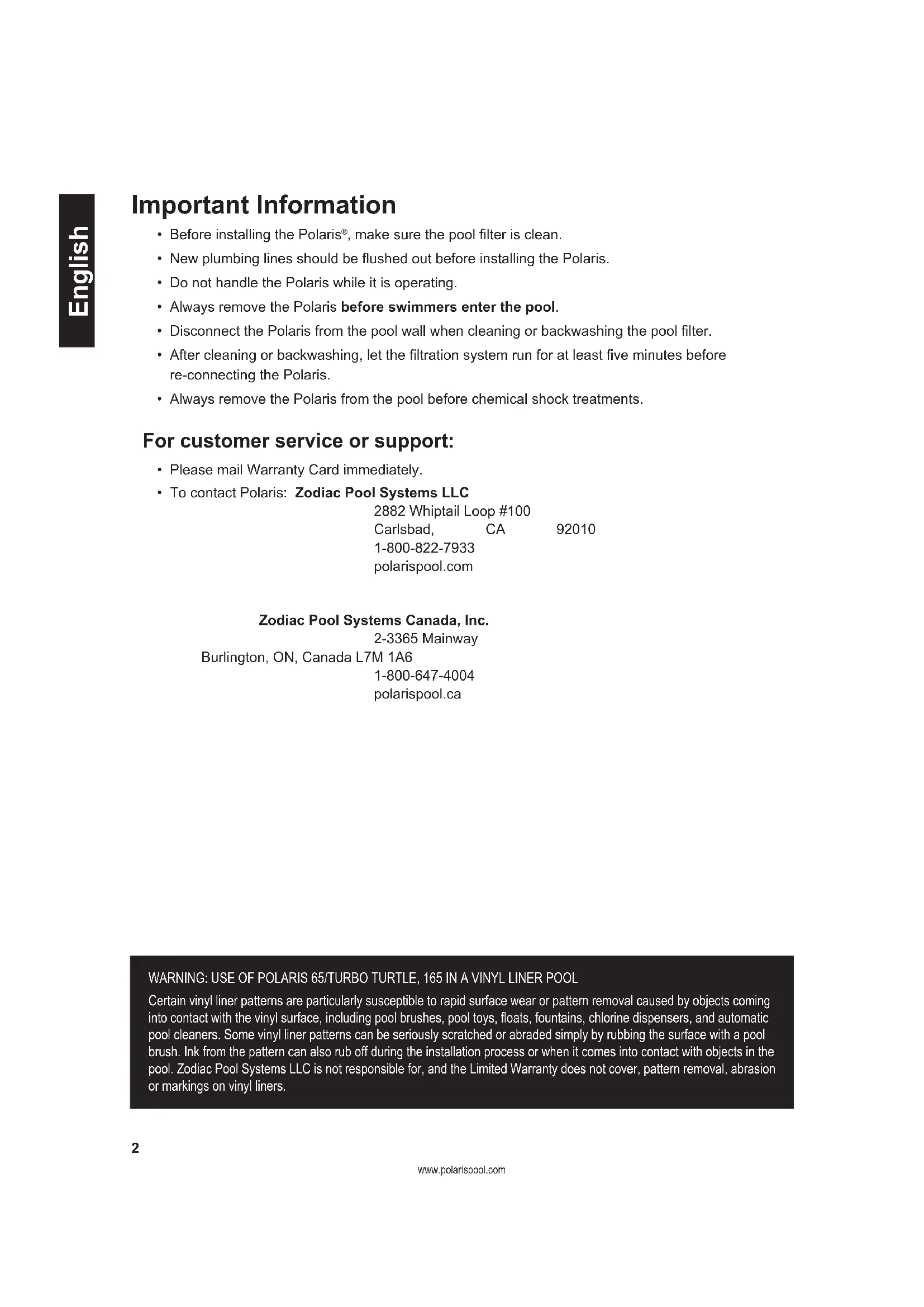 Certain vinyl liner patterns are particularly susceptible to rapid surface wear or pattern removal caused by objects coming into contact with the vinyl surface, including pool brushes, pool toys, floats, fountains, chlorine dispensers, and automatic pool cleaners. Some vinyl liner patterns can be seriously scratched or abraded simply by rubbing the surface with a pool brush. Ink from the pattern can also rub off during the installation process or when it comes into contact with objects in the pool. Zodiac Pool Systems LLC is not responsible for, and the Limited Warranty does not cover, pattern removal, abrasion or markings on vinyl liners. English 2www.polarispool.com Congratulations on the purchase of your new automatic pool cleaner, and thank you for choosing Polaris. The Polaris