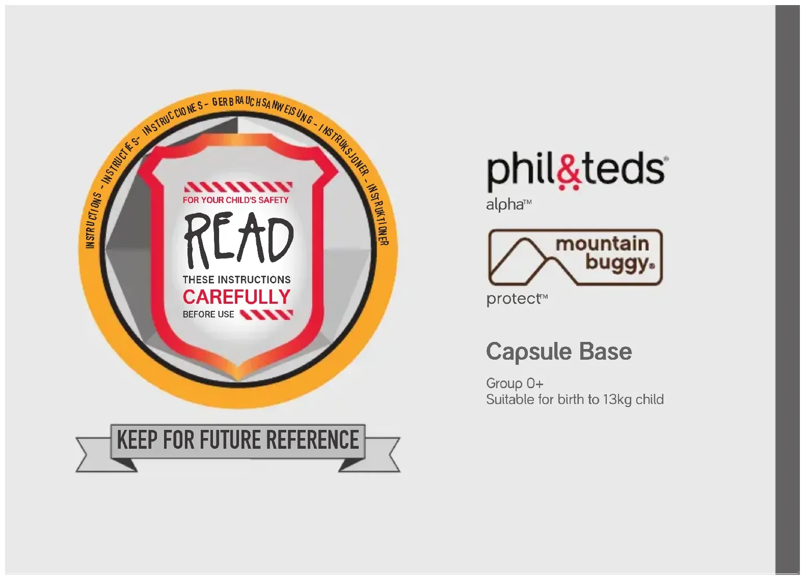 alpha ™mountainbuggy.com Please register your purchase through our online warranty registration by visiting: www.philandteds.com/register For rights & remedies, refer www.philandteds.com/warranty The Capsule Base complies with requirements applicable in market of sale philandteds.comCongratulations on choosing your new car seat capsule base! Product Care Safety Warnings Features InstructionsProduct care CLEANING & CARING Check your car seat for cuts & bruises. If your product is damaged in any way, or you’re not sure how to use it, please consult our web support from where you can access a local customer care team. Caring for your car seat Unlike children, your car seat likes to stay clean. Cleaning the fabric cover: