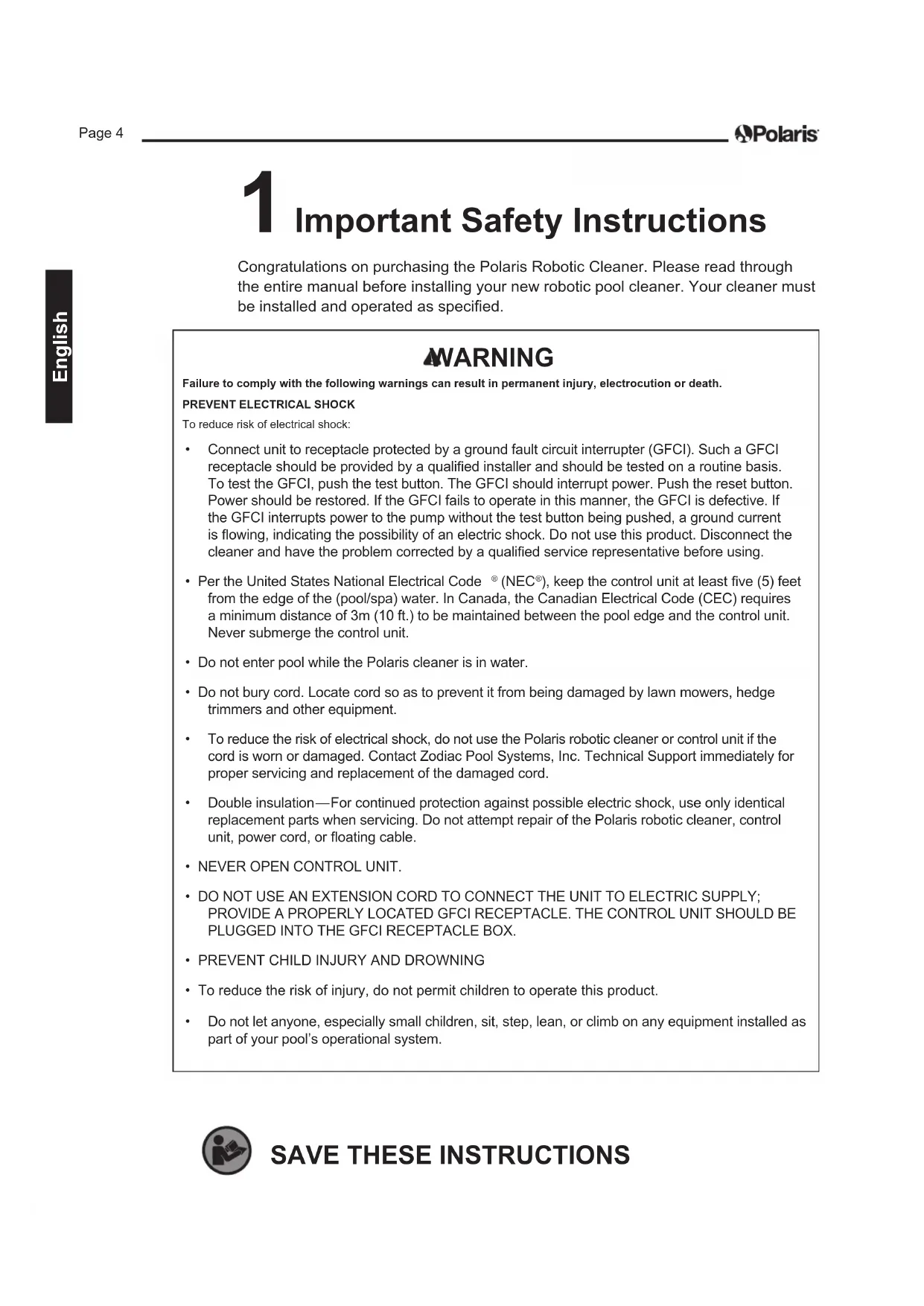 - Do not let anyone, especially small children, sit, step, lean, or climb on any equipment installed as part of your pool’s operational system. 1 Important Safety Instructions Congratulations on purchasing the Polaris Robotic Cleaner. Please read through the entire manual before installing your new robotic pool cleaner. Your cleaner must be installed and operated as specied. SAVE THESE INSTRUCTIONSPage 5 English CAUTION