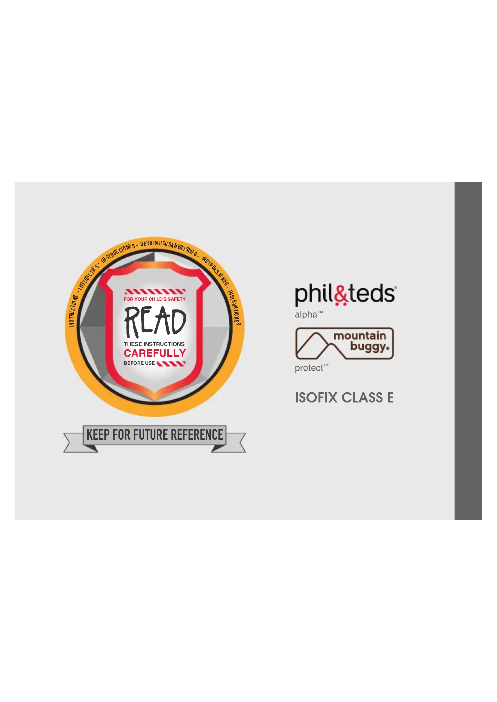 alpha ™Congratulations on choosing your new car seat isox base! Product Care Safety Warnings Features Instructions The ISOFIX CLASS E complies with requirements applicable in market of sale. For rights & remedies, and important online product registration please visit: www.philandteds.com/register www.mountainbuggy.com/register mountainbuggy.com philandteds.com