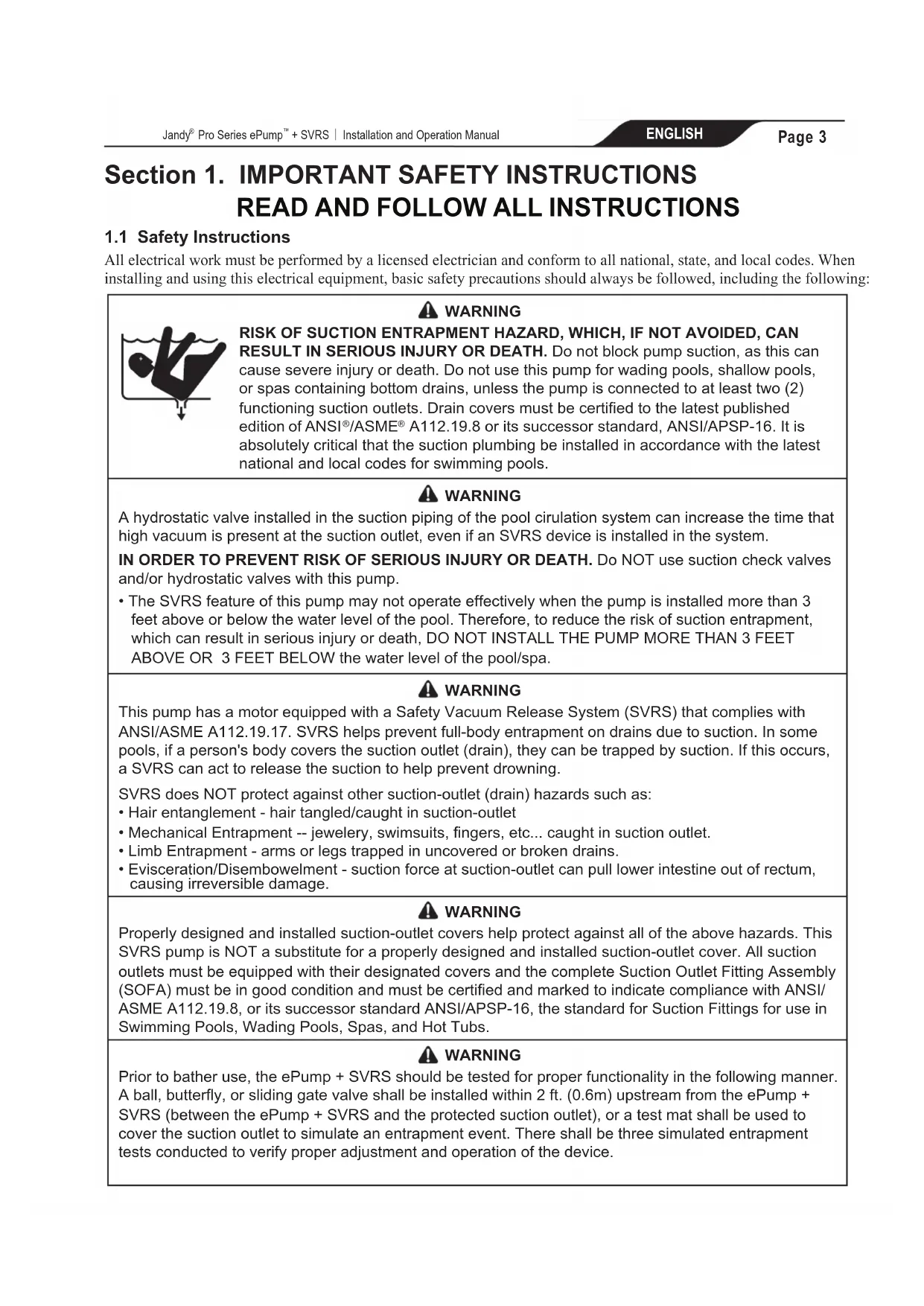 Installation and Operation ManualWARNING The Jandy Pro Series ePump + SVRS has been designed to operate with Jandy control systems. Operating the pump with other manufacturers' controllers may cause software failure of the pump, drive or other system components. This failure can result in severe personal injury (i.e., failure of the SVRS system, electrical shock) or death. DANGER Entrapment Avoidance Notice: Drain covers must be certied to the latest published edition of ANSI