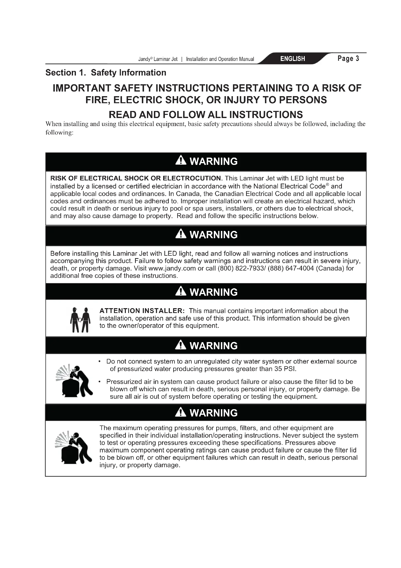 and applicable local codes and ordinances. In Canada, the Canadian Electrical Code and all applicable local codes and ordinances must be adhered to. Improper installation will create an electrical hazard, which could result in death or serious injury to pool or spa users, installers, or others due to electrical shock, and may also cause damage to property. Read and follow the specific instructions below. WARNING Before installing this Laminar Jet with LED light, read and follow all warning notices and instructions accompanying this product. Failure to follow safety warnings and instructions can result in severe injury, death, or property damage. Visit www.jandy.com or call (800) 822-7933/ (888) 647-4004 (Canada) for additional free copies of these instructions. WARNING WARNING ATTENTION INSTALLER: This manual contains important information about the installation, operation and safe use of this product. This information should be given to the owner/operator of this equipment.