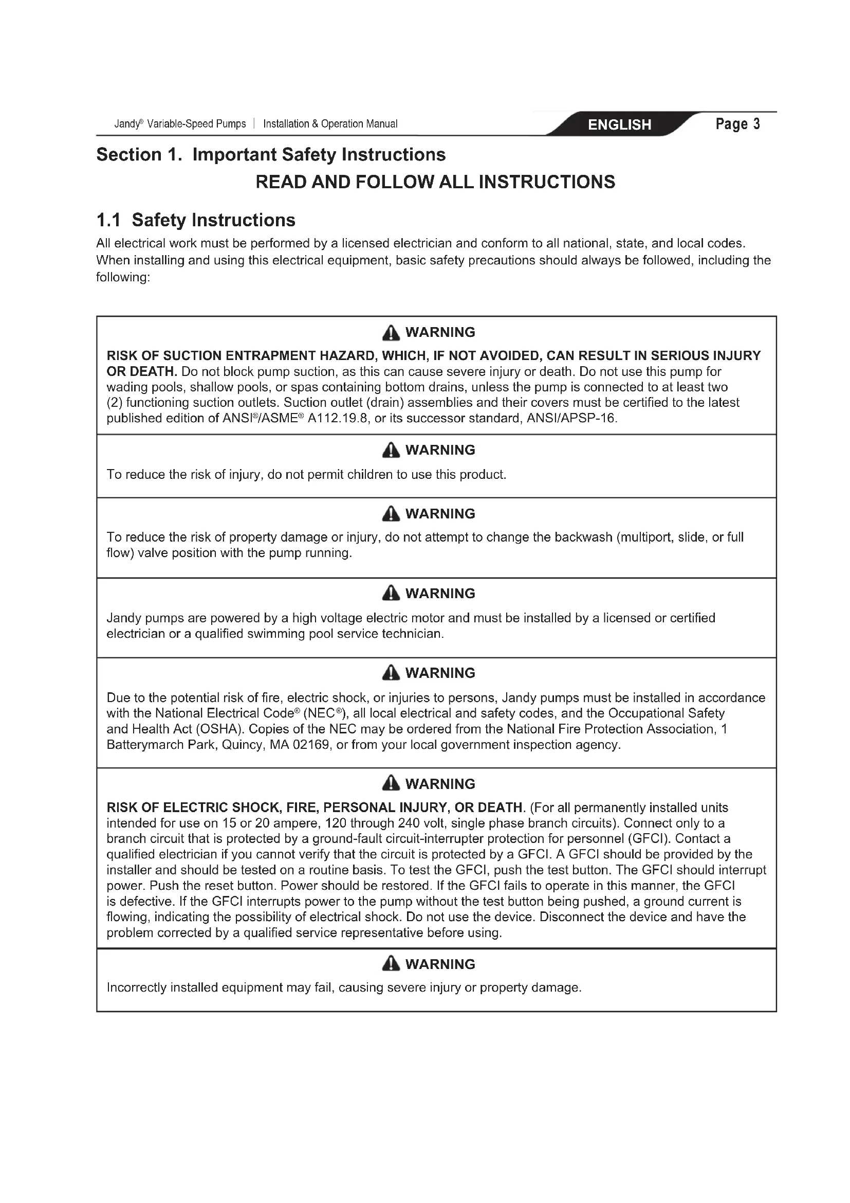 A112.19.8, or its successor standard, ANSI/APSP-16. WARNING To reduce the risk of injury, do not permit children to use this product. WARNING To reduce the risk of property damage or injury, do not attempt to change the backwash (multiport, slide, or full flow) valve position with the pump running. WARNING Jandy pumps are powered by a high voltage electric motor and must be installed by a licensed or certified electrician or a qualified swimming pool service technician. WARNING Due to the potential risk of fire, electric shock, or injuries to persons, Jandy pumps must be installed in accordance with the National Electrical Code