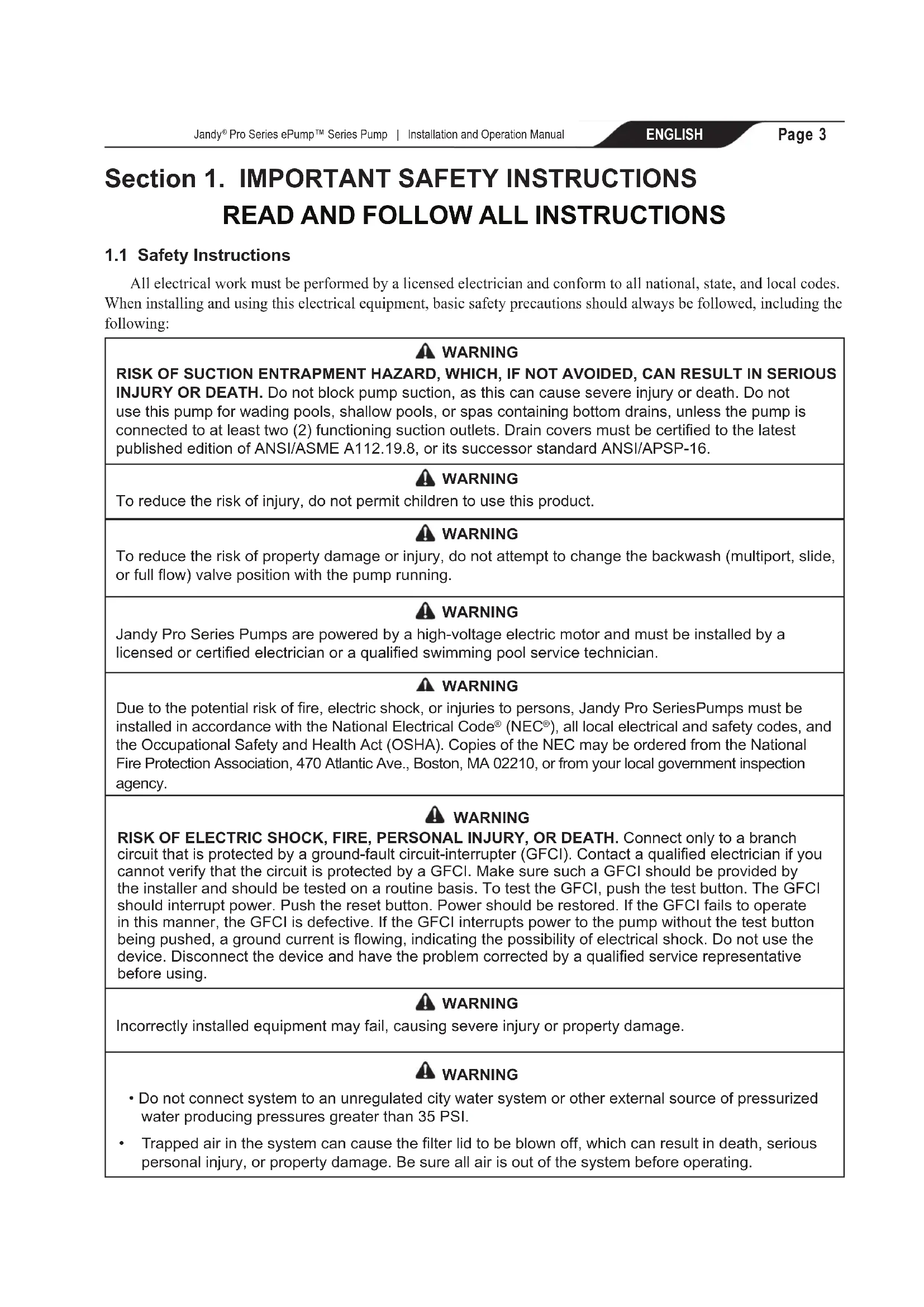 Pro Series ePump™ Series Pump | Installation and Operation Manual ENGLISHSection 1. IMPORTANT SAFETY INSTRUCTIONS