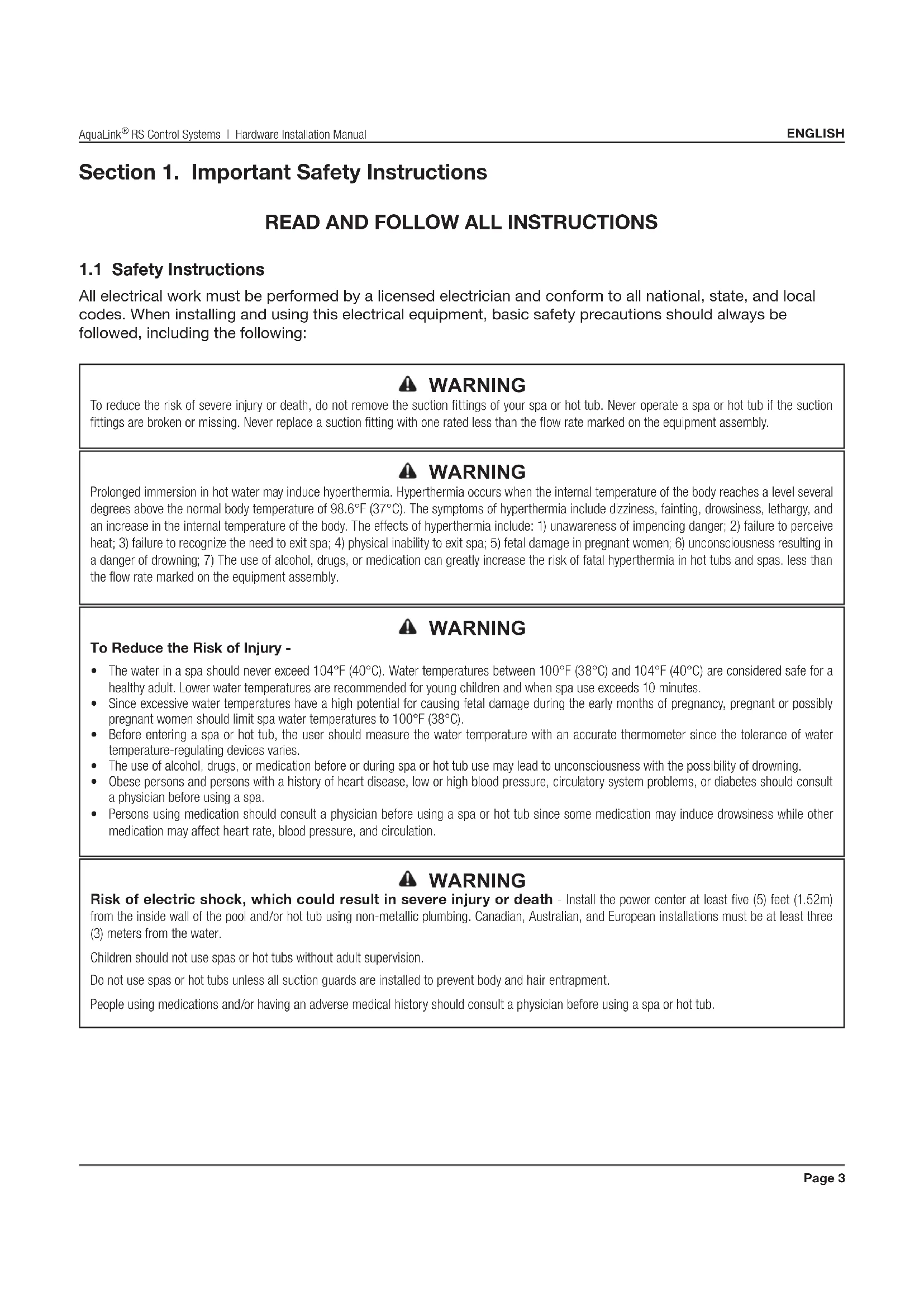 - Persons using medication should consult a physician before using a spa or hot tub since some medication may induce drowsiness while other medication may affect heart rate, blood pressure, and circulation. WARNING Risk of electric shock, which could result in severe injury or death - Install the power center at least five (5) feet (1.52m) from the inside wall of the pool and/or hot tub using non-metallic plumbing. Canadian, Australian, and European installations must be at least three (3) meters from the water. Children should not use spas or hot tubs without adult supervision. Do not use spas or hot tubs unless all suction guards are installed to prevent body and hair entrapment. People using medications and/or having an adverse medical history should consult a physician before using a spa or hot tub.Page 4 ENGLISH AquaLink