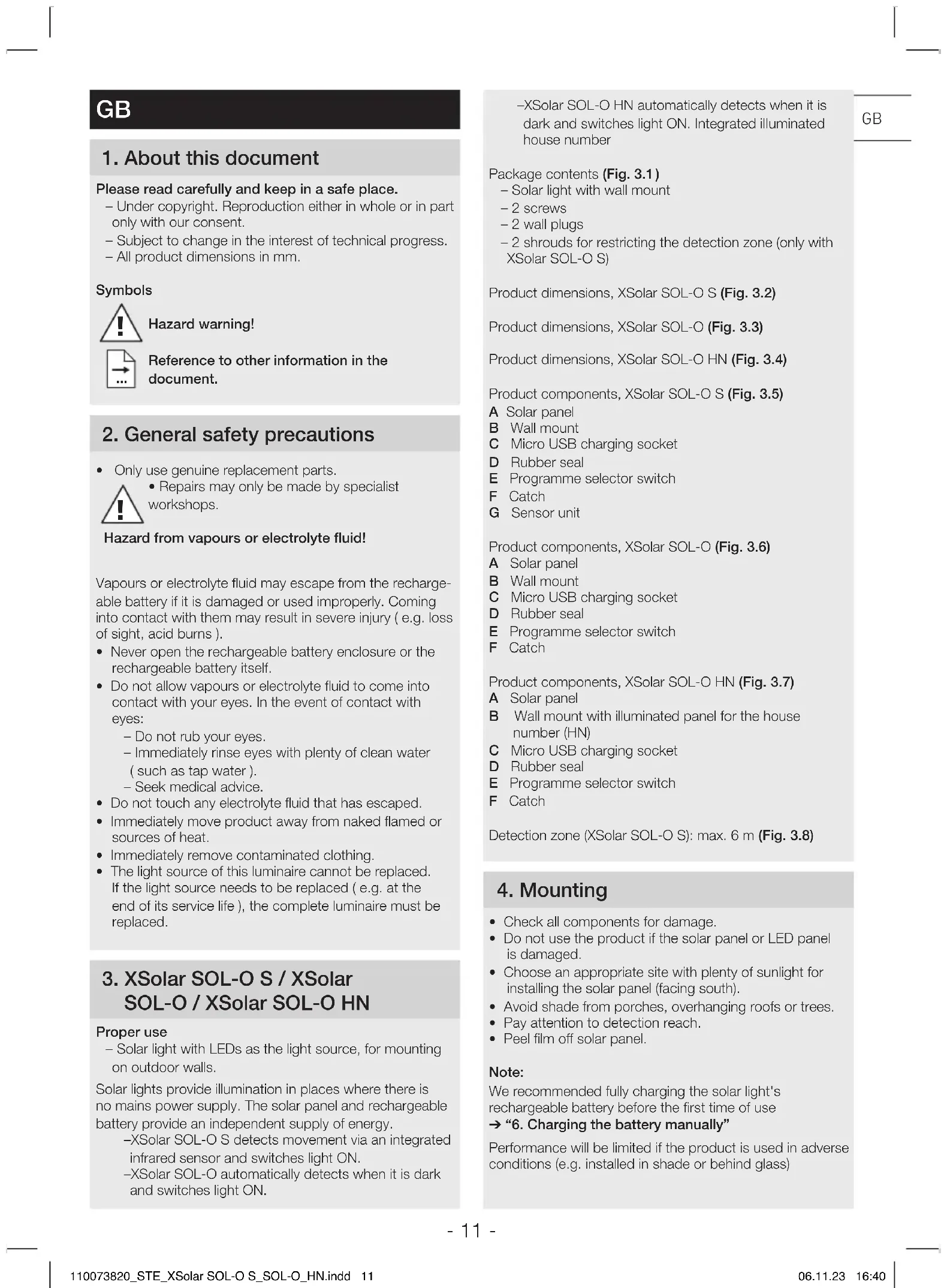 SOL-O/XSolar SOL-O HN Proper use – Solar light with LEDs as the light source, for mounting on outdoor walls.Solar lights provide illumination in places where there is no mains power supply. The solar panel and rechargeable battery provide an independent supply of energy. – XSolar SOL-O S detects movement via an integrated infrared sensor and switches light ON. – XSolar SOL-O automatically detects when it is dark and switches light ON.