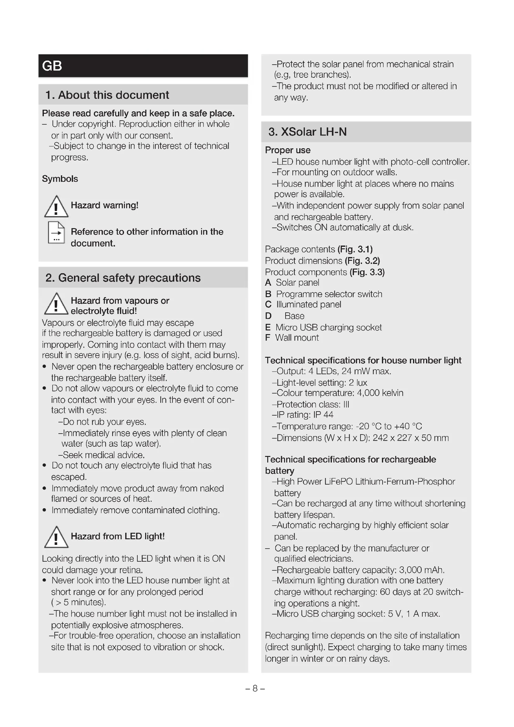 - Never look into the LED house number light at short range or for any prolonged period ( > 5 minutes). – The house number light must not be installed in potentially explosive atmospheres. – For trouble-free operation, choose an installation site that is not exposed to vibration or shock. – Protect the solar panel from mechanical strain (e.g, tree branches). – The product must not be modified or altered in any way. 3 XSolar LH-N Proper use – LED house number light with photo-cell controller. – For mounting on outdoor walls. – House number light at places where no mains power is available. – With independent power supply from solar panel and rechargeable battery. – Switches ON automatically at dusk. Package contents (Fig 31) Product dimensions (Fig 32) Product components (Fig 33) A Solar panel B Programme selector switch C Illuminated panel D Base E Micro USB charging socket F Wall mount Technical specifications for house number light – Output: 4 LEDs, 24 mW max. – Light-level setting: 2 lux – Colour temperature: 4,000 kelvin – Protection class: III – IP rating: IP 44 – Temperature range: -20 °C to +40 °C – Dimensions (WxHxD): 242 x 227 x 50 mm Technical specifications for rechargeable battery – High Power LiFePO Lithium-Ferrum-Phosphor battery – Can be recharged at any time without shortening battery lifespan. – Automatic recharging by highly ecient solar panel. – Can be replaced by the manufacturer or qualified electricians. – Rechargeable battery capacity: 3,000mAh. – Maximum lighting duration with one battery charge without recharging: 60 days at 20 switch- ing operations a night. – Micro USB charging socket: 5 V, 1 A max. Recharging time depends on the site of installation (direct sunlight). Expect charging to take many times longer in winter or on rainy days.– 9 – Risk of damage to property from penetrating moisture When open, the micro USB charging socket (E) is not protected from the ingress of water.