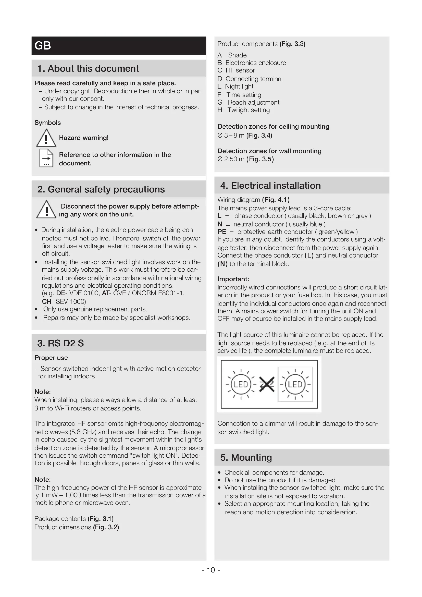 - During installation, the electric power cable being con-nected must not be live. Therefore, switch o the power first and use a voltage tester to make sure the wiring is o-circuit. • Installing the sensor-switched light involves work on the mains supply voltage. This work must therefore be car-ried out professionally in accordance with national wiring regulations and electrical operating conditions. (e.g. DE- VDE 0100, AT- ÖVE / ÖNORM E8001-1, CH- SEV 1000)• Only use genuine replacement parts.• Repairs may only be made by specialist workshops. 3 RS D2 S Proper use- Sensor-switched indoor light with active motion detector for installing indoorsNote:When installing, please always allow a distance of at least 3 m to Wi-Fi routers or access points.The integrated HF sensor emits high-frequency electromag-netic waves (5.8 GHz) and receives their echo. The change in echo caused by the slightest movement within the light's detection zone is detected by the sensor. A microprocessor then issues the switch command "switch light ON". Detec-tion is possible through doors, panes of glass or thin walls. Note: The high-frequency power of the HF sensor is approximate-ly 1mW – 1,000 times less than the transmission power of a mobile phone or microwave oven.Package contents (Fig31)Product dimensions (Fig32) !- 11 - Mounting procedure