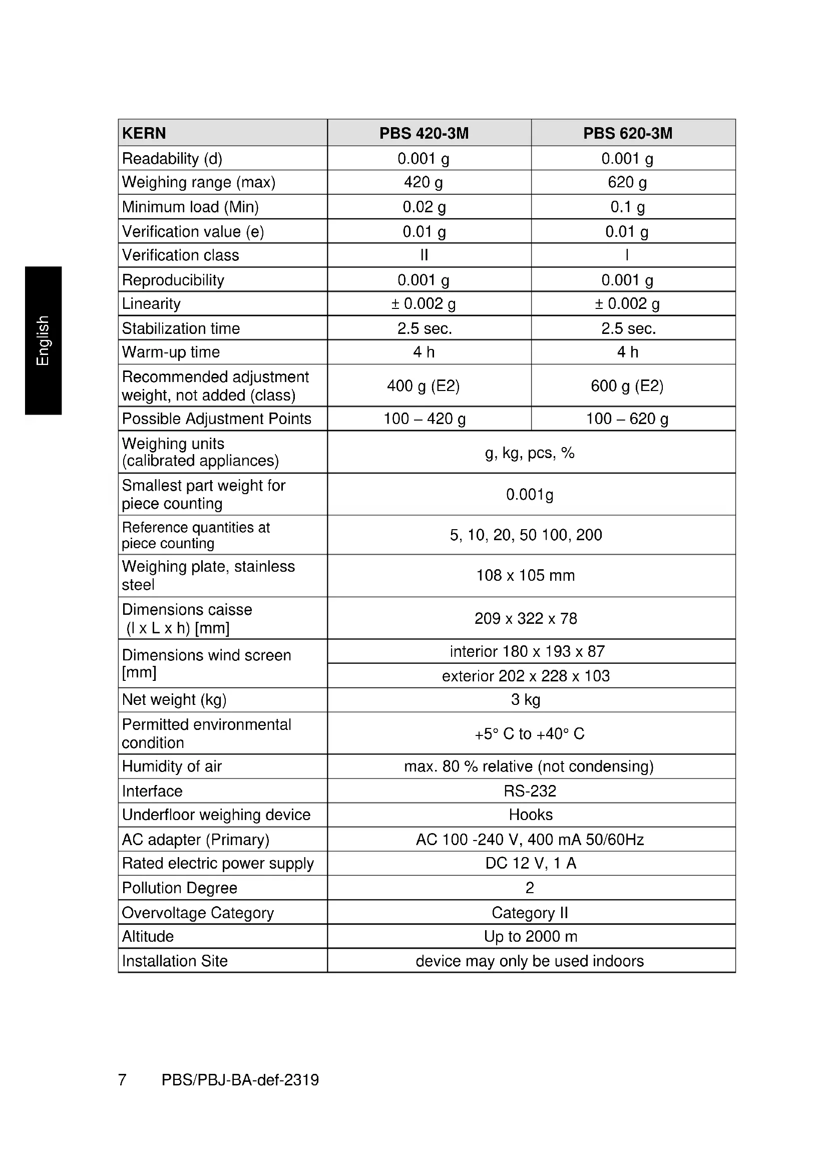 Warm-up time 4 h 4 h Recommended adjustment weight, not added (class) 400 g (E2) 600 g (E2) Possible Adjustment Points 100 – 420 g 100 – 620 g Weighing units (calibrated appliances) g, kg, pcs, % Smallest part weight for piece counting 0.001g Reference quantities at piece counting 5, 10, 20, 50 100, 200 Weighing plate, stainless steel 108 x 105 mm Dimensions caisse (l x L x h) [mm] 209 x 322 x 78 Dimensions wind screen [mm] interior 180 x 193 x 87 exterior 202 x 228 x 103 Net weight (kg) 3 kg Permitted environmental condition +5° C to +40° C Humidity of air max. 80 % relative (not condensing) Interface RS-232 Underfloor weighing device Hooks AC adapter (Primary) AC 100 -240 V, 400 mA 50/60Hz Rated electric power supply DC 12 V, 1 A Pollution Degree
