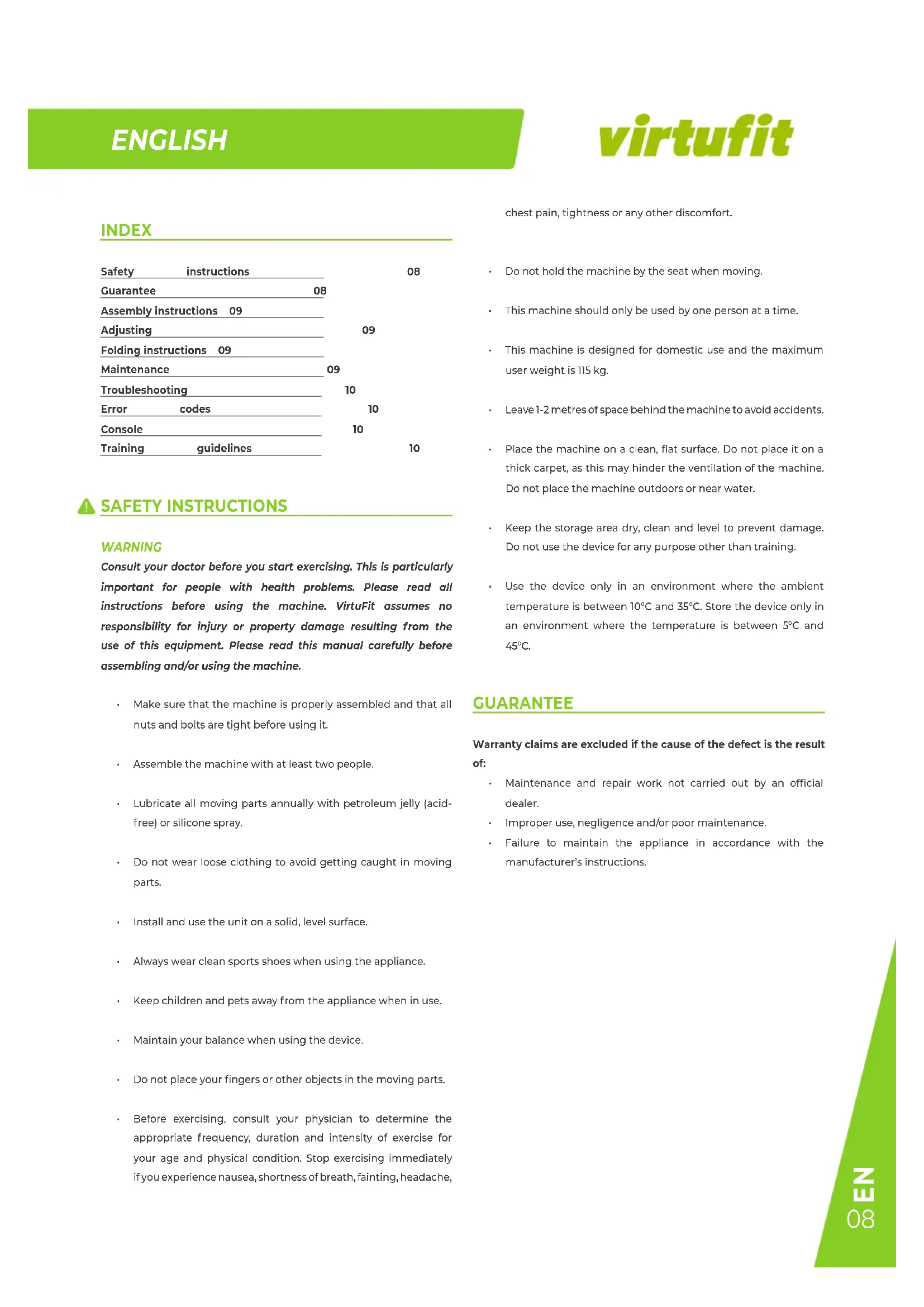 INDEX Safety instructions 08 Guarantee 08 Assembly instructions 09 Adjusting 09 Folding instructions 09 Maintenance 09 Troubleshooting 10 Error codes 10 Console 10 Training guidelines 10 SAFETY INSTRUCTIONS WARNING Consult your doctor before you start exercising. This is particularly important for people with health problems. Please read all instructions before using the machine. VirtuFit assumes no responsibility for injury or property damage resulting from the use of this equipment. Please read this manual carefully before assembling and/or using the machine.