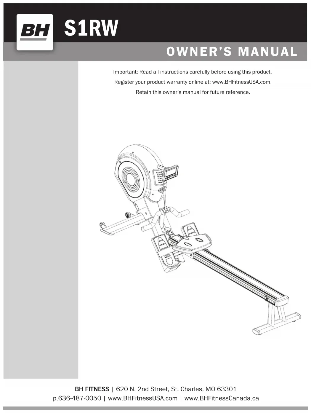 BH FITNESS | 620 N. 2nd Street, St. Charles, MO 63301 p.636-487-0050 | www.BHFitnessUSA.com | www.BHFitnessCanada.ca Important: Read all instructions carefully before using this product. Register your product warranty online at: www.BHFitnessUSA.com. Retain this owner’s manual for future reference.Register your product warranty online at: www.BHFitnessUSA.com Questions regarding warranty and parts call: 636.634.2217