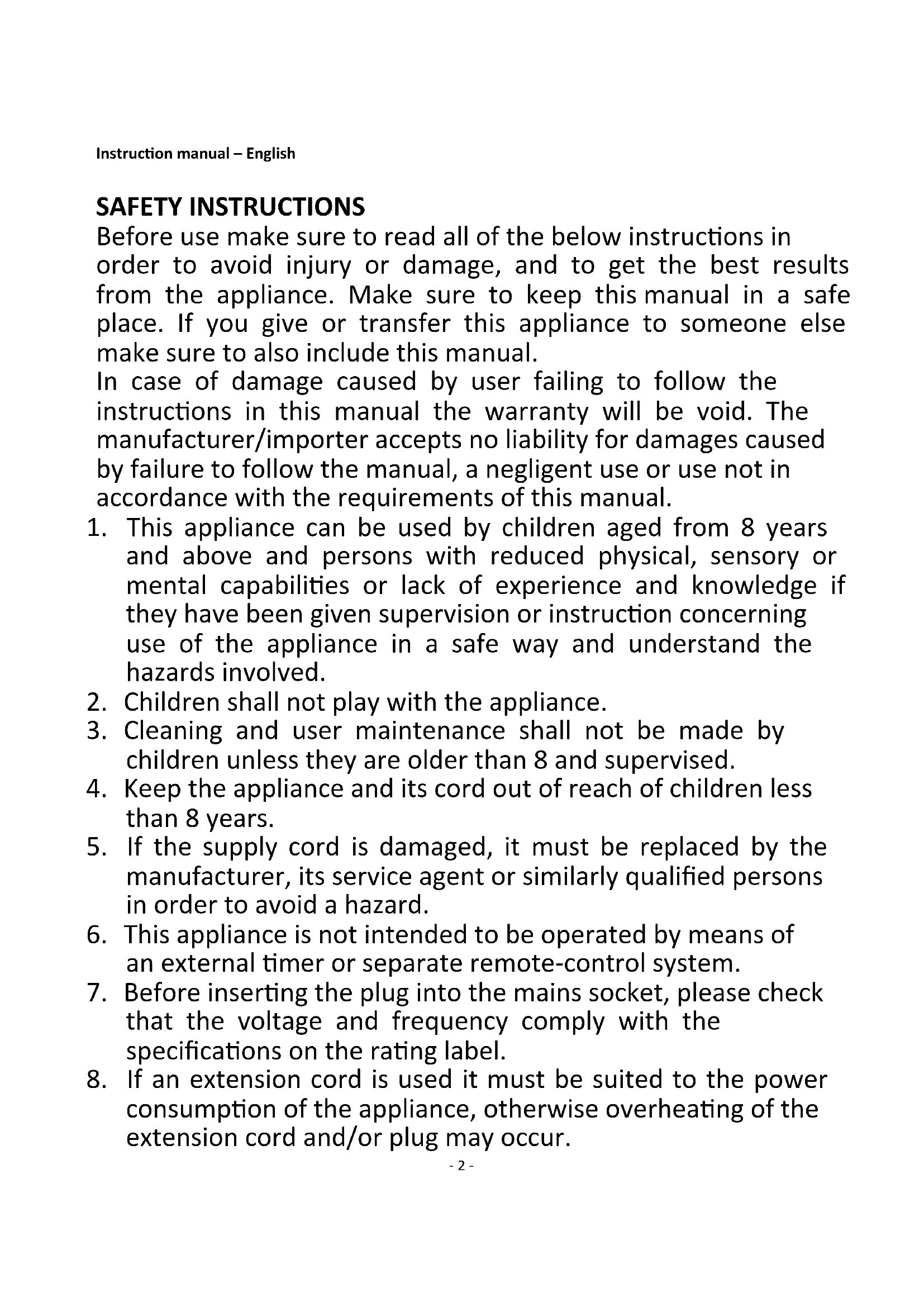 Instruction manual – English ..................................................................................... - 2 - Bedienungsanleitung – Deutsch ................................................................................ - 6 - Mode d‘emploi – Français ........................................................................................- 11 - Manuale d'istruzioni – Italiano .................................................................................- 16 -- 2 - Instruction manual – English SAFETY INSTRUCTIONS Before use make sure to read all of the below instructions in order to avoid injury or damage, and to get the best results from the appliance. Make sure to keep this manual in a safe place. If you give or transfer this appliance to someone else make sure to also include this manual. In case of damage caused by user failing to follow the instructions in this manual the warranty will be void. The manufacturer/importer accepts no liability for damages caused by failure to follow the manual, a negligent use or use not in accordance with the requirements of this manual.
