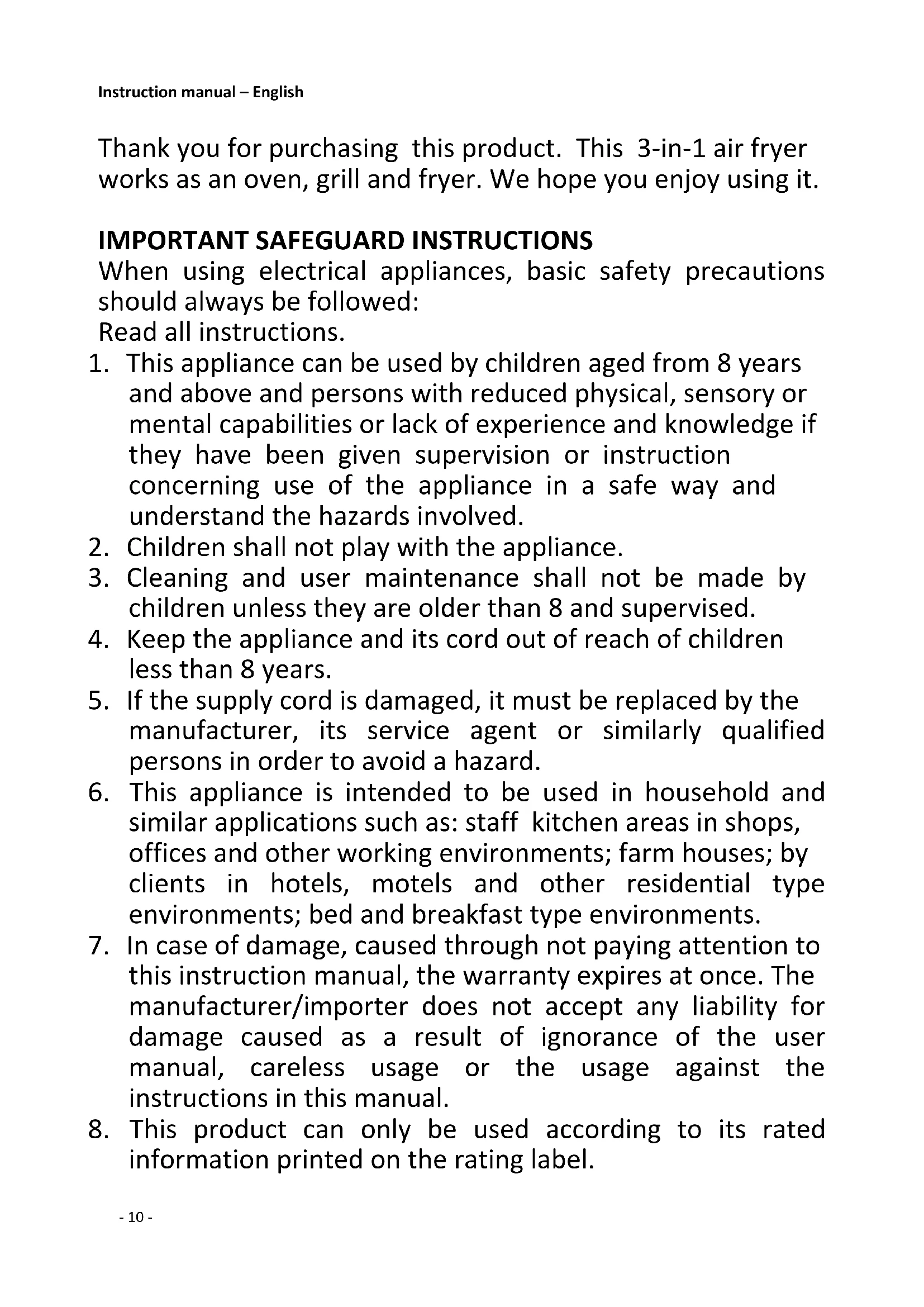 Before delivery our devices are subjected to rigorous quality control. If, despite all care, damage has occurred during production or transportation, please return the device to your dealer. In addition to statutory legal rights, the purchaser has an option to claim under the terms of the following guarantee: For the purchased device we provide 2 years guarantee, commencing from the day of sale. If you have a defective product, you can directly go back to the point of purchase. Defects which arise due to improper handling of the device and malfunctions due to interventions and repairs by third parties or the fitting of non-original parts are not covered by this guarantee. Always keep your receipt, without the receipt you can’t claim any form of warranty. Damage caused by not following the instruction manual, will lead to a void of warranty, if this results in consequential damages then we will not be liable. Neither can we hold responsible for material damage or personal injury caused by improper use if the instruction manual is not properly executed. Damage to accessories does not mean free replacement of the whole appliance. In such case please contact our service department. Broken glass or breakage of plastic parts Problem Possible cause Solution The appliance does not work. The appliance is not plugged in. Put the mains plug in an earthed wall socket. You have not set the timer. Turn the timer knob to the required preparation time to switch on the appliance. The ingredients are not fried completely. The amount of the food in the basket is over. Put smaller batches of ingredients in the basket. Smaller batches are fried more evenly. The temperature is too low. Turn the temperature control knob to the requied temperature. The ingredients are fried unevenly. Different types of food may need to be shaken halfway. Shake food halfway. Basket cannot be slided into the housing properly. Too much food in the basket. Put less amount of food in the basket. White smoke comes out from the appliance. You are preparing greasy ingredients. When you fry greasy ingredients, oil will leak into the basket. The oil preoduces white smoke and the basket may heat up. This does not affect the cooking result or hurt the appliance. The basket still contains grease residues from previous use. Clean the basket properly after each use.- 16 - is always subject to a charge. Defects to consumables or parts subjected to wearing, as well as cleaning, maintenance or the replacement of said parts are not covered by the warranty and are to be paid.