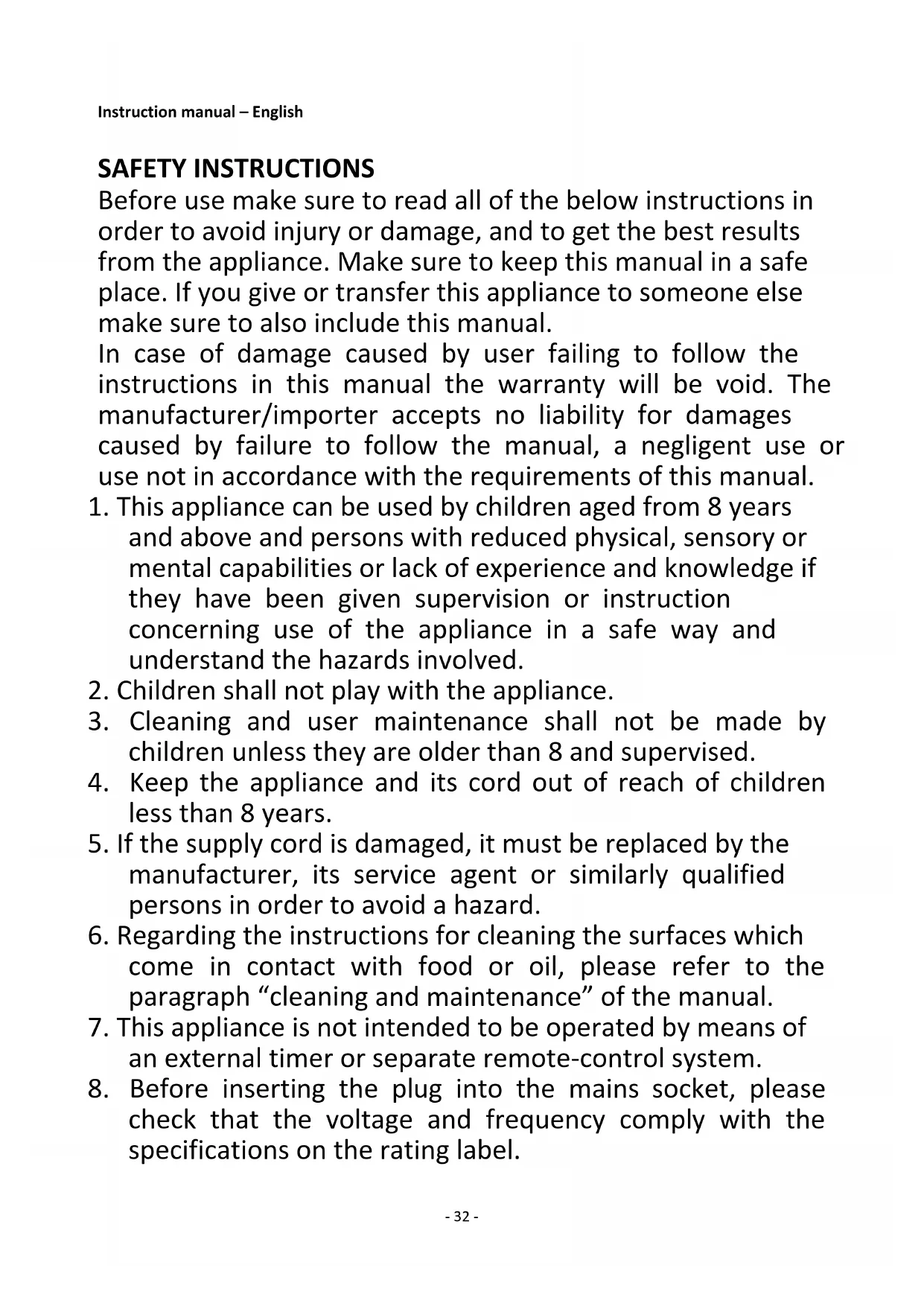 Before delivery our devices are subjected to rigorous quality control. If, despite all care, damage has occurred during production or transportation, please return the device to your dealer. In addition to statutory legal rights, the purchaser has an option to claim under the terms of the following guarantee: For the purchased device we provide 2 years guarantee, commencing from the day of sale. If you have a defective product, you can directly go back to the point of purchase. Defects which arise due to improper handling of the device and malfunctions due to interventions and repairs by third parties or the fitting of non-original parts are not covered by this guarantee. Always keep your receipt, without the receipt you can’t claim any form of warranty. Damage caused by not following the instruction manual, will lead to a void of warranty, if this results in consequential damages then we will not be liable. Neither can we hold responsible for material damage or personal injury caused by improper use if the instruction manual is not properly executed. Damage to accessories does not mean free replacement of the whole appliance. In such case please contact our service department. Broken glass or breakage of plastic parts is always subject to a charge. Defects to consumables or parts subjected to wearing, as well as cleaning, maintenance or the replacement of said parts are not covered by the warranty and are to be paid.