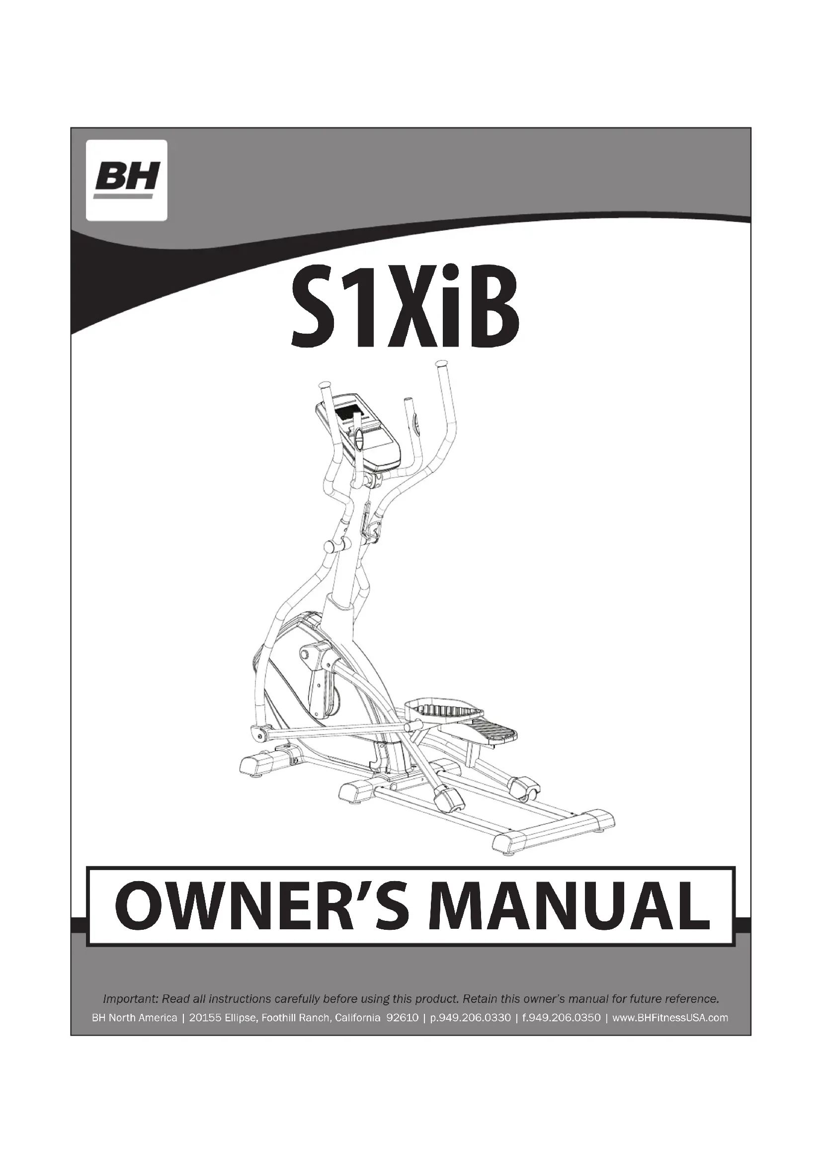 S1XiB Important: Read all instructions carefully before using this product. Retain this owner’s manual for future reference. BH North America | 20155 Ellipse, Foothill Ranch, California 92610 | p.949.206.0330 | f.949.206.0350 | www.BHFitnessUSA.comTABLE OF CONTENTS Title Page Introduction 03 Warnings and Labels 04 Safety Information 05 Exercise Instruction 06 Training Guidelines 07 Suggested Stretches 11 Pre-Assembly Checklist 13 Assembly Instructions 15 Console Operations 27 Maintenance and Cleaning 36 Exploded View Drawing 37 Parts List 38 Warranty 403 CONGRATULATIONS Congratulations on your purchase of BH Fitness equipment. We hope you appreciate the style, quality, and value that exercisers around the world have come to expect from BH Fitness. If you have any questions, concerns or product issues please call our Customer Service Team at 1-866-325-2339 or email us at CustomerSupport@BHNorthAmerica.com. Carefully read through the instructions contained in this manual. ey provide you with important information about assembly, safety, tness and use of the machine. Please read ALL the safety information contained on the following page.4