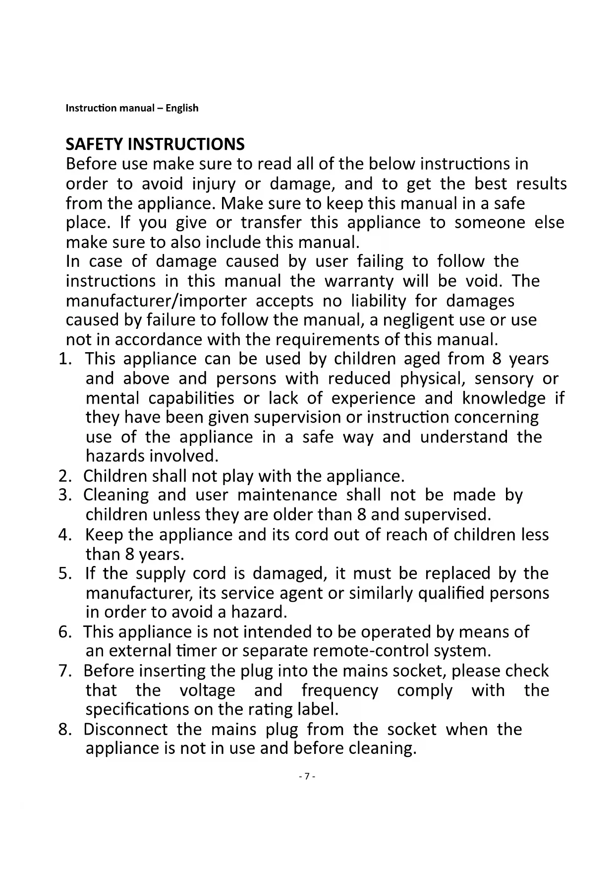 Before delivery our devices are subjected to rigorous quality control. If, despite all care, damage has occurred during production or transportation, please return the device to your dealer. In addition to statutory legal rights, the purchaser has an option to claim under the terms of the following guarantee: For the purchased device we provide 2 years guarantee, commencing from the day of sale. If you have a defective product, you can directly go back to the point of purchase. Defects which arise due to improper handling of the device and malfunctions due to interventions and repairs by third parties or the fitting of non-original parts are not covered by this guarantee. Always keep your receipt, without the receipt you can’t claim any form of warranty. Damage caused by not following the instruction manual, will lead to a void of warranty, if this results in consequential damages then we will not be liable. Neither can we hold responsible for material damage or personal injury caused by improper use if the instruction manual is not properly executed. Damage to accessories does not mean free replacement of the whole appliance. In such case please contact our service department. Broken glass or breakage of plastic parts is always subject to a charge. Defects to consumables or parts subjected to wearing, as well as cleaning, maintenance or the replacement of said parts are not covered by the warranty and are to be paid.