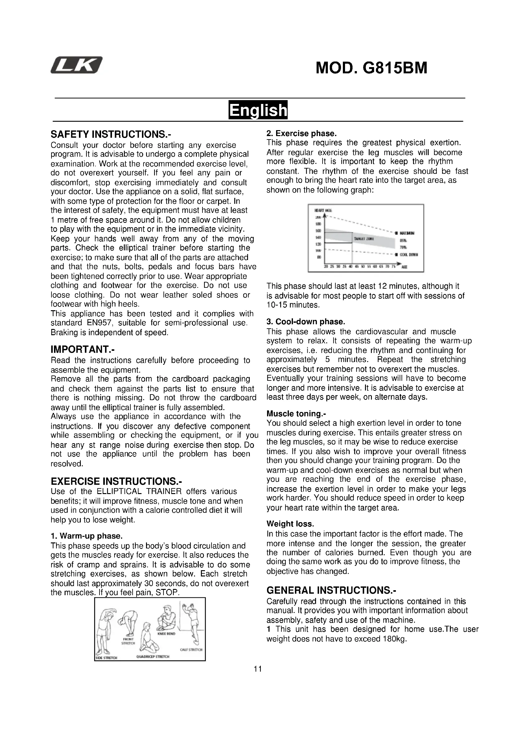 u should select a high exertion level in order to tone muscles during exercise. This entails greater stress on the leg muscles, so it may be wise to reduce exercise times. If you also wish to improve your overall fitness then you should change your training program. Do the warm-up and cool-down exercises as normal but when you are reaching the end of the exercise phase, increase the exertion level in order to make your legs work harder. You should reduce speed in order to keep your heart rate within the target area. Weight loss. In this case the important factor is the effort made. The more intense and the longer the session, the greater the number of calories burned. Even though you are doing the same work as you do to improve fitness, the objective has changed. GENERAL INSTRUCTIONS.- Carefully read through the instructions contained in this manual. It provides you with important information about assembly, safety and use of the machine. 1 This unit has been designed for home use.The user weight does not have to exceed 180kg.