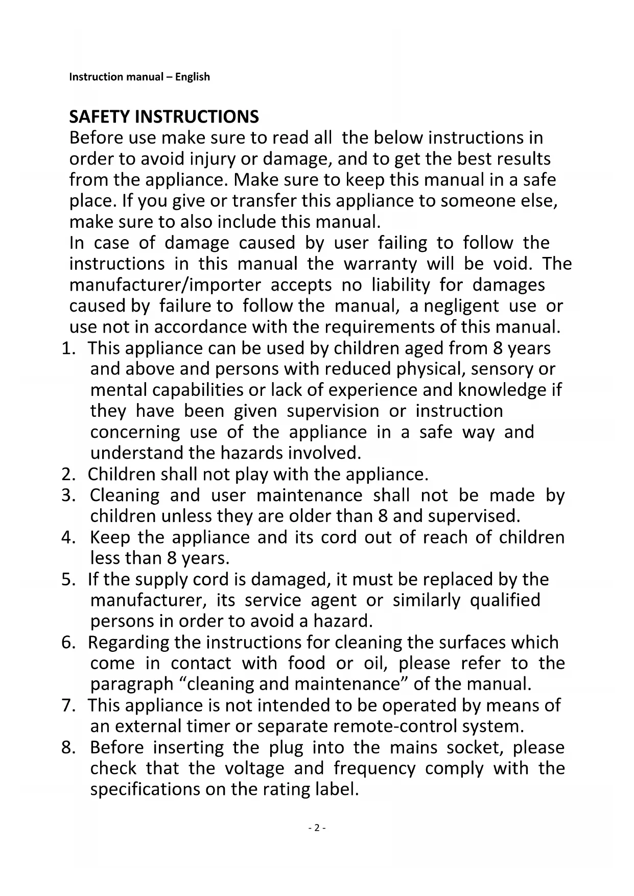 Instruction manual – English ...................................................................................... - 2 - Bedienungsanleitung – Deutsch ................................................................................. - 9 - Mode d‘emploi – Français ........................................................................................ - 18 - Manuale d'istruzioni – Italiano ................................................................................. - 26 -- 2 - Instruction manual – English SAFETY INSTRUCTIONS Before use make sure to read all the below instructions in order to avoid injury or damage, and to get the best results from the appliance. Make sure to keep this manual in a safe place. If you give or transfer this appliance to someone else, make sure to also include this manual. In case of damage caused by user failing to follow the instructions in this manual the warranty will be void. The manufacturer/importer accepts no liability for damages caused by failure to follow the manual, a negligent use or use not in accordance with the requirements of this manual.
