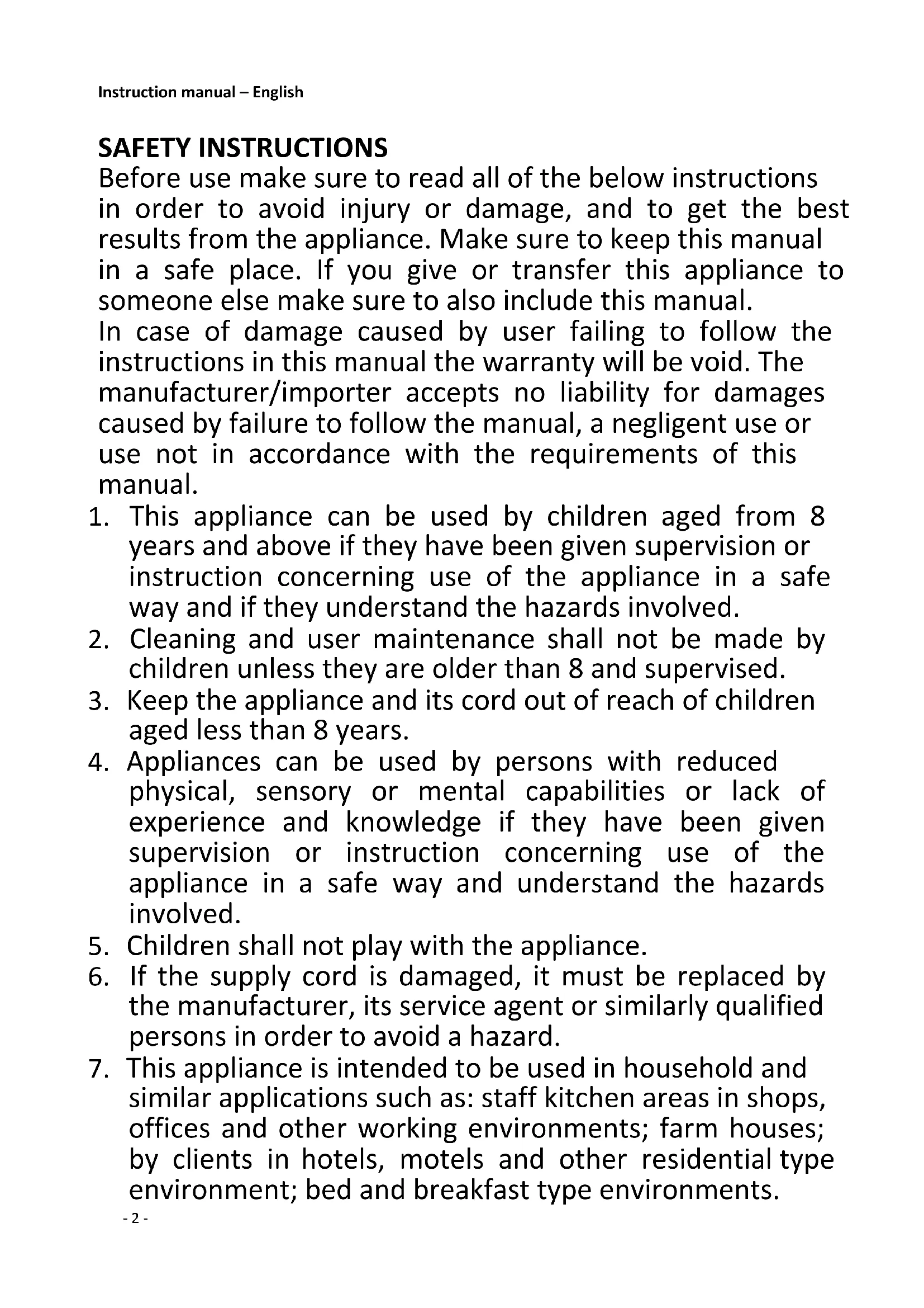 7. This appliance is intended to be used in household and