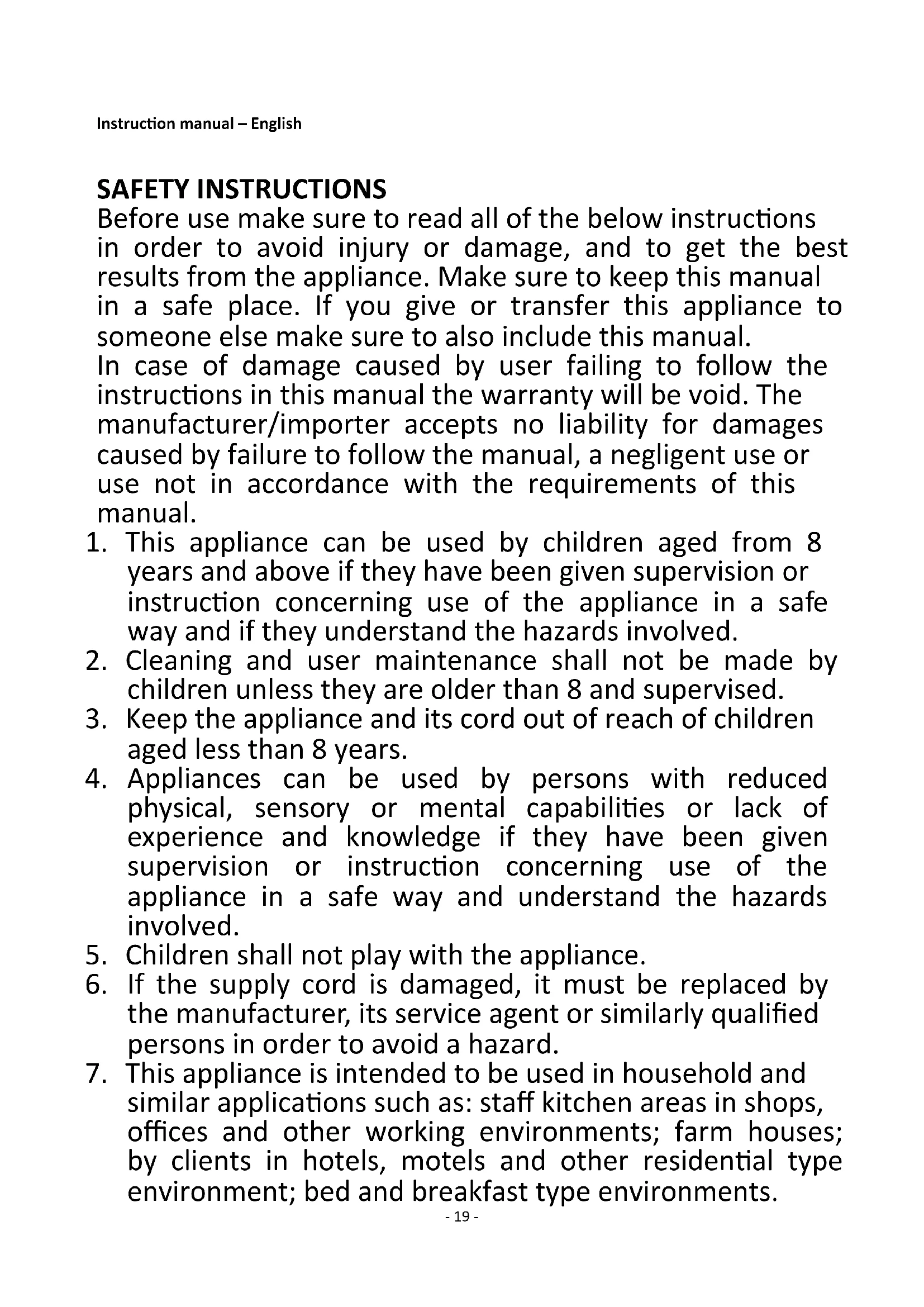 Before delivery our devices are subjected to rigorous quality control. If, despite all care, damage has occurred during production or transportation, please return the device to your dealer. In addition to statutory legal rights, the purchaser has an option to claim under the terms of the following guarantee: For the purchased device we provide 2 years guarantee, commencing from the day of sale. If you have a defective product, you can directly go back to the point of purchase. Defects which arise due to improper handling of the device and malfunctions due to interventions and repairs by third parties or the fitting of non-original parts are not covered by this guarantee. Always keep your receipt, without the receipt you can’t claim any form of warranty. Damage caused by not following the instruction manual, will lead to a void of warranty, if this results in consequential damages then we will not be liable. Neither can we hold responsible for material damage or personal injury caused by improper use if the instruction manual is not properly executed. Damage to accessories does not mean free replacement of the whole appliance. In such case please contact our service department. Broken glass or breakage of plastic parts is always subject to a charge. Defects to consumables or parts subjected to wearing, as well as cleaning, maintenance or the replacement of said parts are not covered by the warranty and are to be paid.