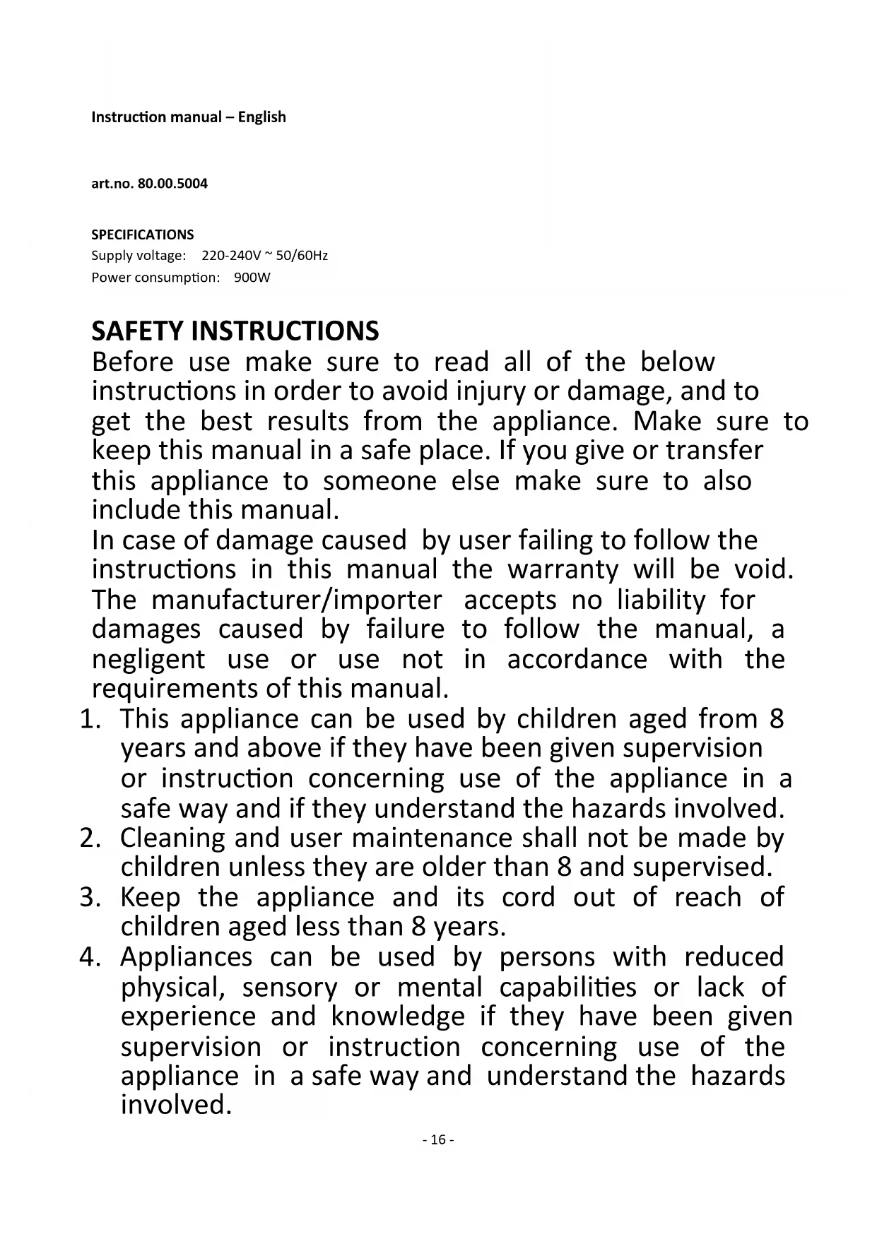 novembre 2019 Hema B.V. Boîte postale 37110 1030 AC Amsterdam Pays-Bas Ces conditions de garantie sont valables sans préjudice des droits légaux du client ou des actions intentées par lui.- 16 - Instruction manual – English art.no. 80.00.5004 SPECIFICATIONS Supply voltage: 220-240V ~ 50/60Hz Power consumption: 900W SAFETY INSTRUCTIONS Before use make sure to read all of the below instructions in order to avoid injury or damage, and to get the best results from the appliance. Make sure to keep this manual in a safe place. If you give or transfer this appliance to someone else make sure to also include this manual. In case of damage caused by user failing to follow the instructions in this manual the warranty will be void. The manufacturer/importer accepts no liability for damages caused by failure to follow the manual, a negligent use or use not in accordance with the requirements of this manual.