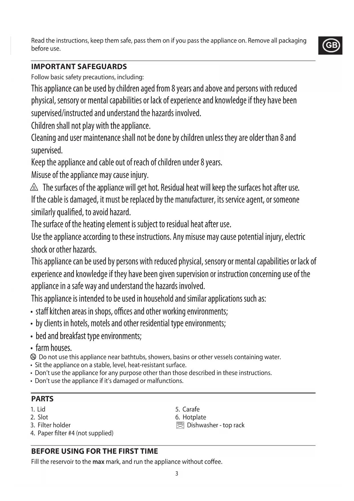 Read the instructions, keep them safe, pass them on if you pass the appliance on. Remove all packaging before use. IMPORTANT SAFEGUARDS Follow basic safety precautions, including: This appliance can be used by children aged from 8 years and above and persons with reduced physical, sensory or mental capabilities or lack of experience and knowledge if they have been supervised/instructed and understand the hazards involved. Children shall not play with the appliance. Cleaning and user maintenance shall not be done by children unless they are older than 8 and supervised. Keep the appliance and cable out of reach of children under 8 years. Misuse of the appliance may cause injury. h The surfaces of the appliance will get hot. Residual heat will keep the surfaces hot after use. If the cable is damaged, it must be replaced by the manufacturer, its service agent, or someone similarly qualied, to avoid hazard. The surface of the heating element is subject to residual heat after use. Use the appliance according to these instructions. Any misuse may cause potential injury, electric shock or other hazards. This appliance can be used by persons with reduced physical, sensory or mental capabilities or lack of experience and knowledge if they have been given supervision or instruction concerning use of the appliance in a safe way and understand the hazards involved. This appliance is intended to be used in household and similar applications such as: