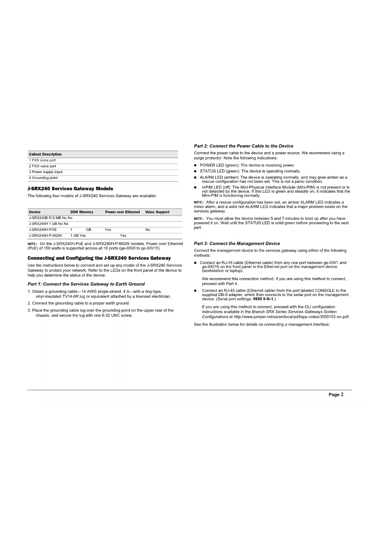 Connect the management device to the services gateway using either of the following methods: Connect an RJ-45 cable (Ethernet cable) from any one port between ge-0/0/1 and ge-0/0/15 on the front panel to the Ethernet port on the management device (workstation or laptop). We recommend this connection method. If you are using this method to connect, proceed with Part 4. Connect an RJ-45 cable (Ethernet cable) from the port labeled CONSOLE to the supplied DB-9 adapter, which then connects to the serial port on the management device. (Serial port settings: 9600 8-N-1.) If you are using this method to connect, proceed with the CLI configuration instructions available in the Branch SRX Series Services Gateways Golden Configurations at http://www.juniper.net/us/en/local/pdf/app-notes/3500153-en.pdf. See the illustration below for details on connecting a management interface: Callout Description 1 FXS voice port2 FXO voice port3 Power supply input4 Grounding point Device DDR Memory Power over Ethernet Voice Support J-SRX240B 512 MB No NoJ-SRX240H 1 GB No NoJ-SRX240H-POE 1 GB Yes NoJ-SRX240H-P-MGW 1 GB Yes YesPage 3