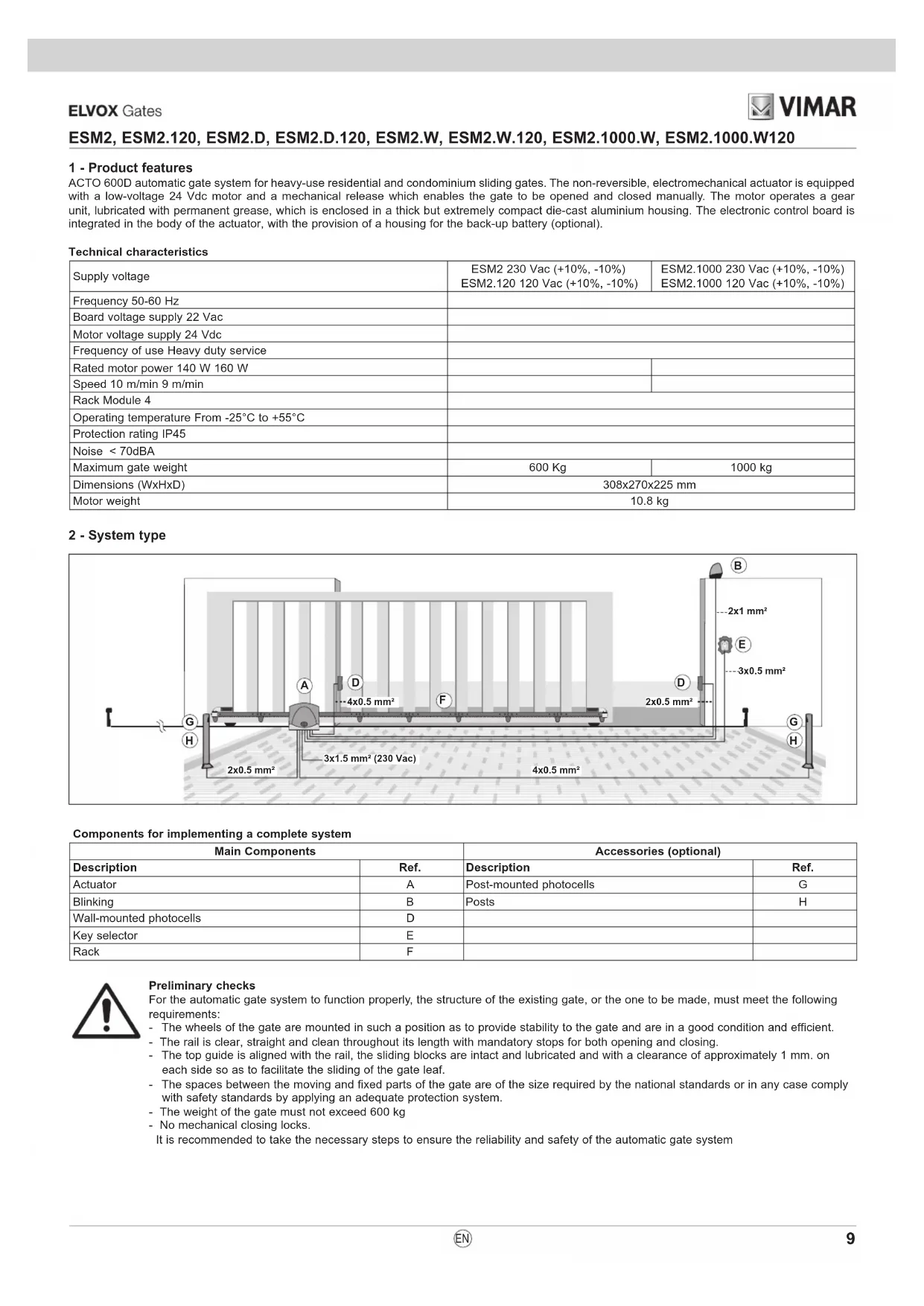 2x1 mm²3x0.5 mm²4x0.5 mm² 2x0.5 mm²3x1.5 mm² (230 Vac) Components for implementing a complete system Main Components Accessories (optional) Description Ref. Description Ref. Actuator A Post-mounted photocells G Blinking B Posts H Wall-mounted photocells D Key selector E Rack F10 ESM2, ESM2.120, ESM2.D, ESM2.D.120, ESM2.W, ESM2.W.120, ESM2.1000.W, ESM2.1000.W120