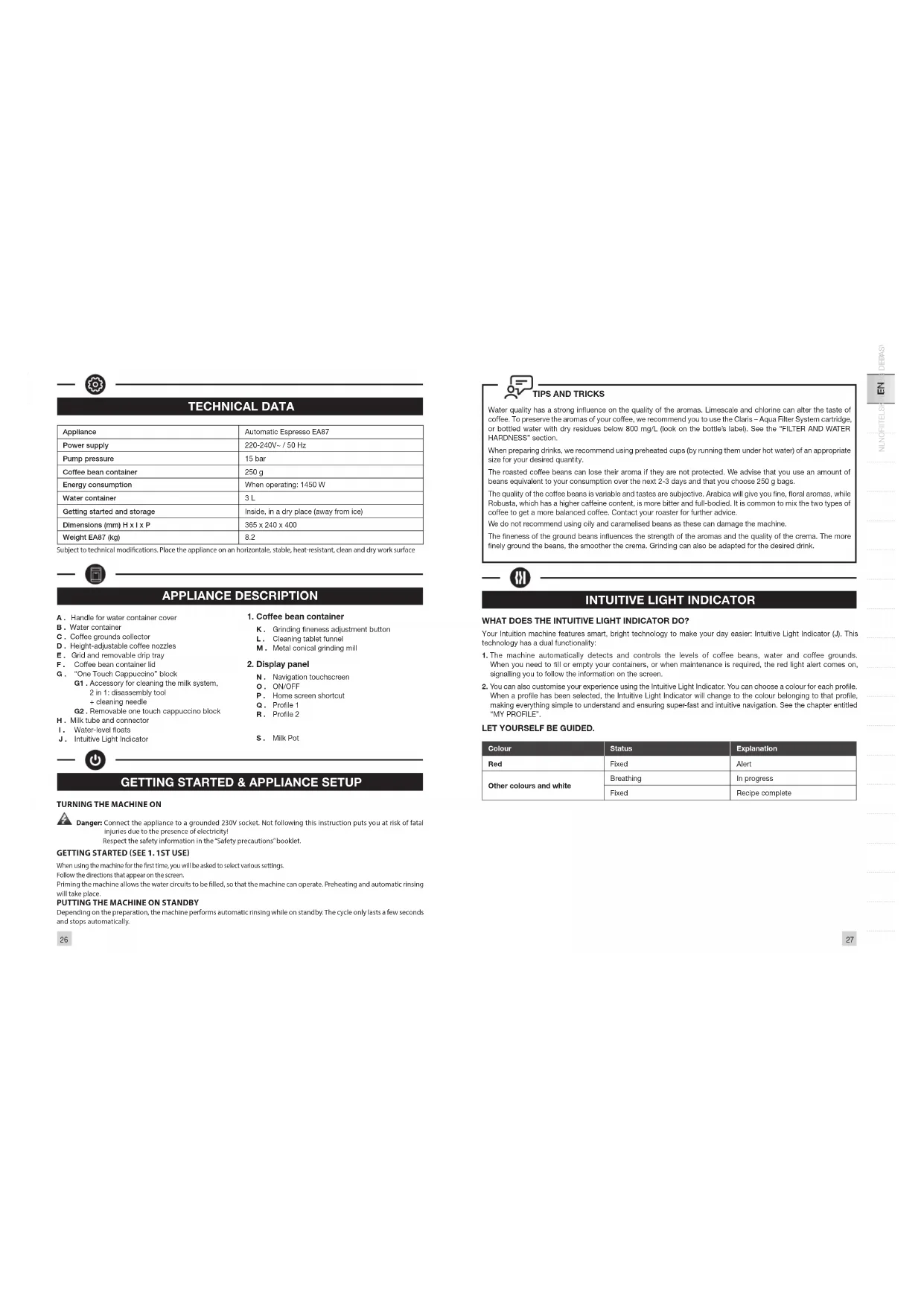 NLNOFIITELSKPLUKBG DEDASVESPTCSHURUROHR TECHNICAL DATA Appliance Automatic Espresso EA87 Power supply 220-240V~ / 50 Hz Pump pressure 15 bar Coffee bean container 250 g Energy consumption When operating: 1450 W Water container 3 L Getting started and storage Inside, in a dry place (away from ice) Dimensions (mm) H x l x P 365 x 240 x 400 Weight EA87 (kg)