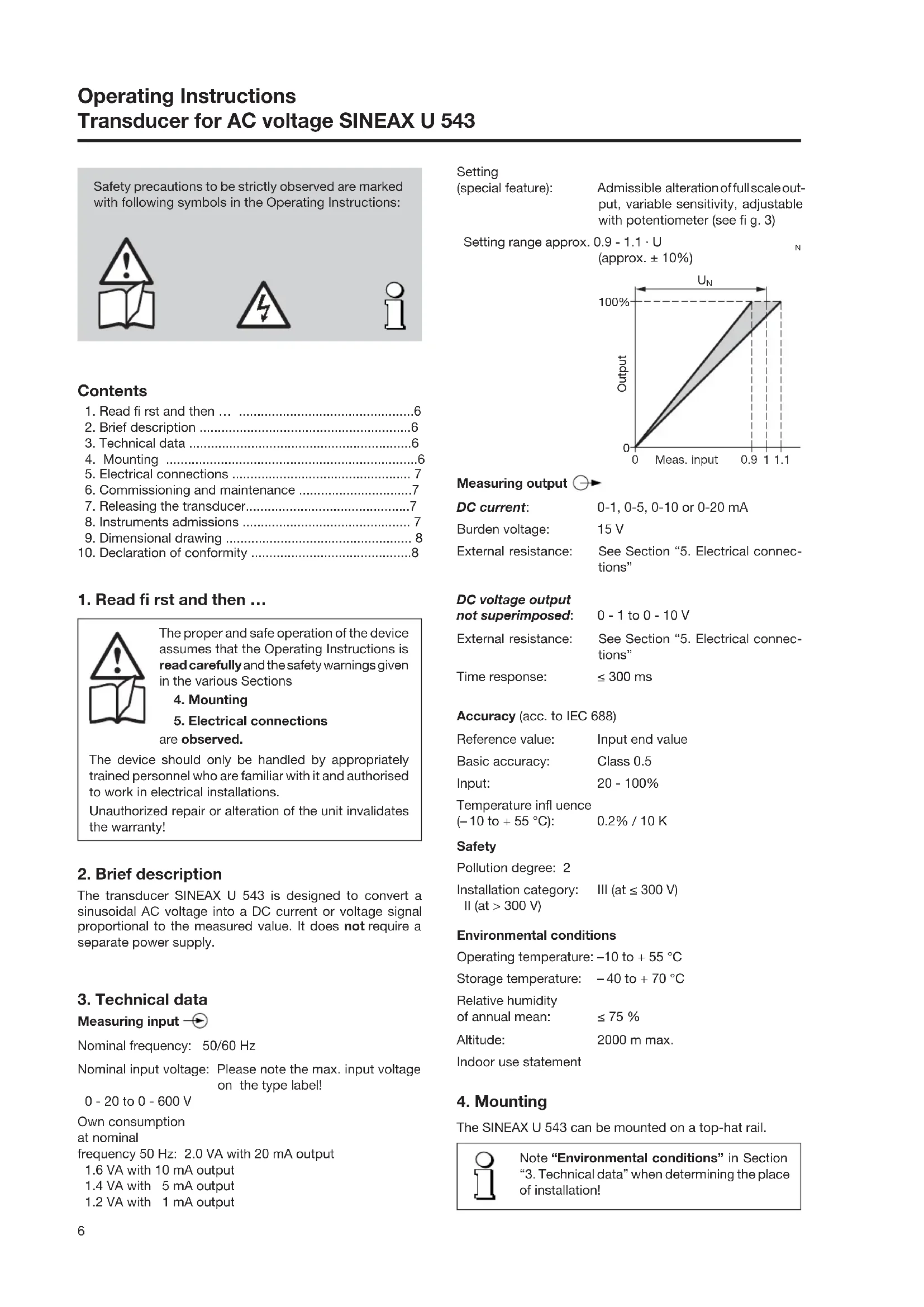 The transducer SINEAX U 543 is designed to convert a sinusoidal AC voltage into a DC current or voltage signal proportional to the measured value. It does not require a separate power supply. Safety precautions to be strictly observed are marked with following symbols in the Operating Instructions: Contents