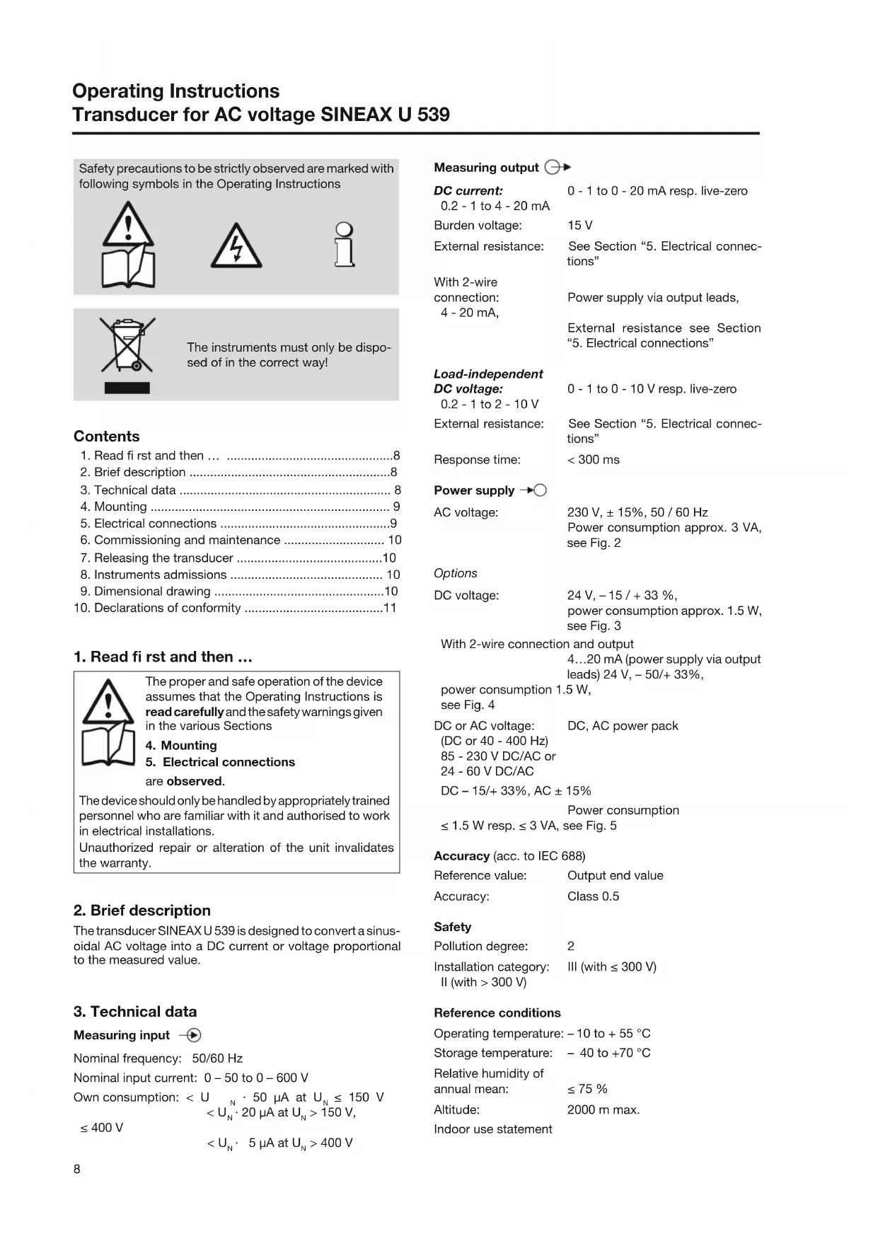DC – 15/+ 33%, AC ± 15% Power consumption ≤ 1.5 W resp. ≤ 3 VA, see Fig. 5 Accuracy (acc. to IEC 688) Reference value: Output end value Accuracy: Class 0.5 Safety Pollution degree: 2 Installation category: III (with ≤ 300 V) II (with > 300 V) Reference conditions Operating temperature: – 10 to + 55 °C Storage temperature: – 40 to +70 °C Relative humidity of annual mean: ≤ 75 % Altitude: 2000 m max. Indoor use statement9