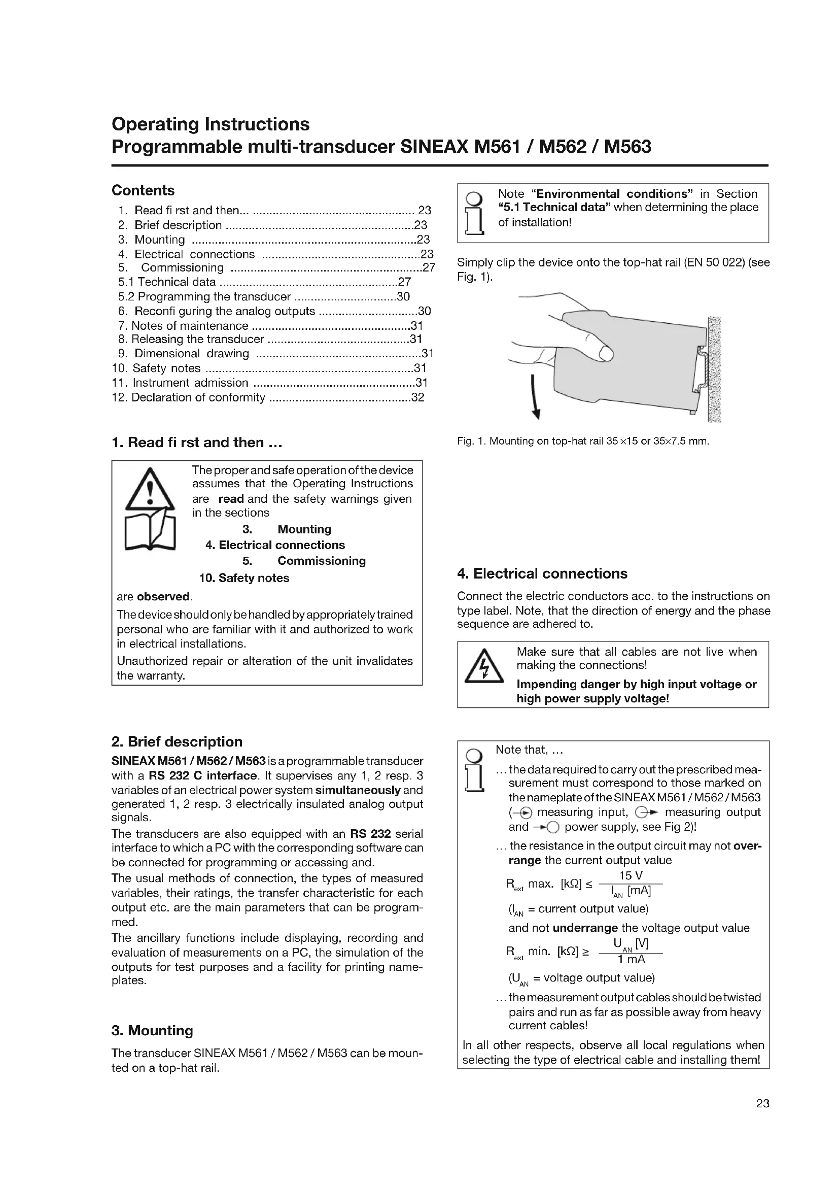 Operating Instructions Programmable multi-transducer SINEAX M561 / M562 / M563 Contents