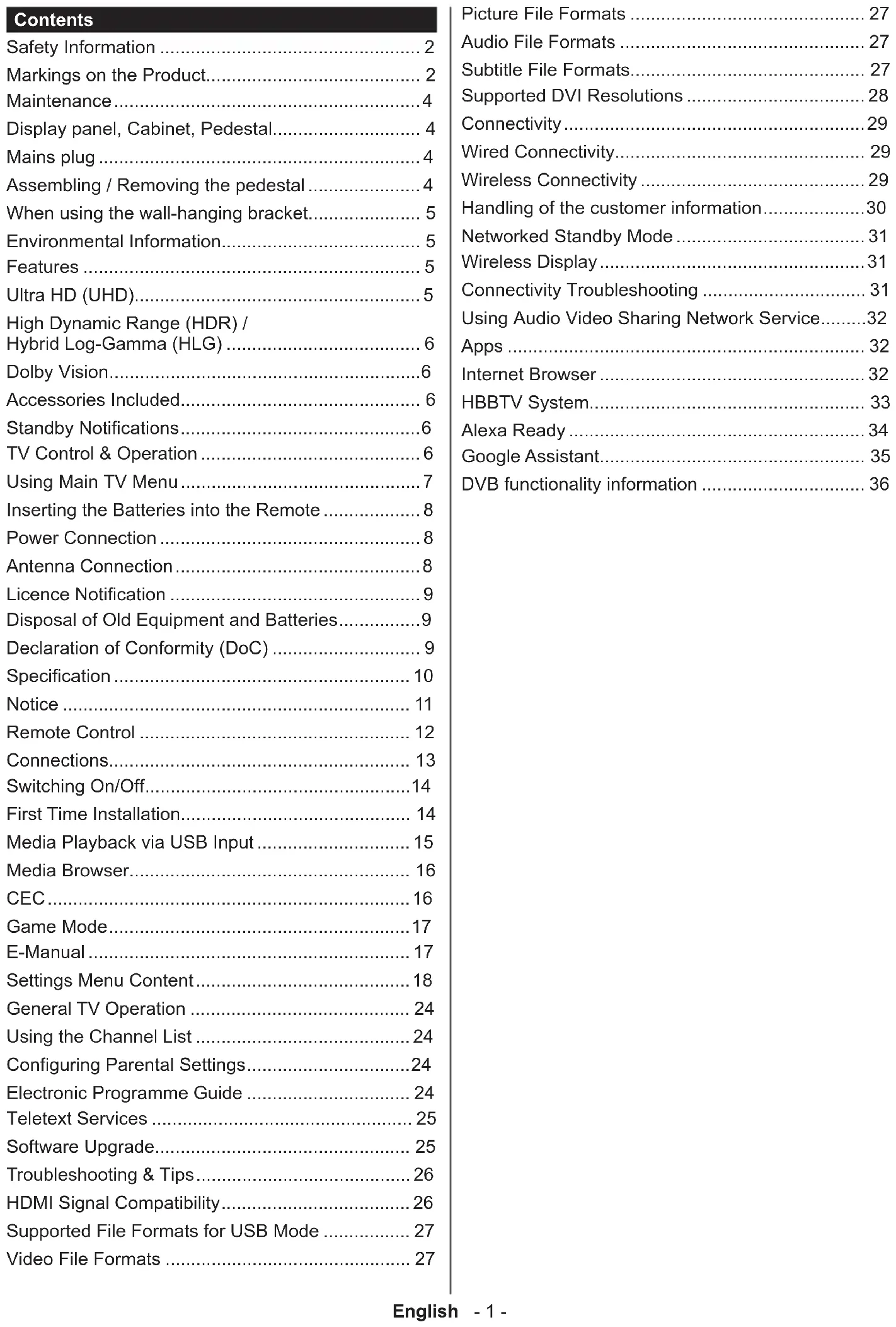 Screen Set as Off to disable this feature or choose one of the inactivity periods to enable. 15 min, 30 min, 1 hour and 2 hour options will be available. Alexa Alarm Volume Sets the volume level for Alexa alarms. Sign Out You can use this option to sign out. If you sign out Alexa Built-in feature will be disabled..English - 23 - Works With Alexa Starts the setup process for this feature manually. If the setup is priorly completed Friendly Name and Sign Out options will be available. Refer to Alexa Ready section for more information. Friendly Name You can define a new name for your TV using this option. Sign Out You can use this option to sign out. If you sign out Works With Alexa feature will be disabled. Google Assistant Starts the setup process to enable your TV to work with Google Assistant devices. Highlight Start and press OK. If the setup is priorly completed Sign Out option will be available. If you sign out Google Assistant feature will be disabled. Refer to Google Assistant section for more information. More Displays other setting options of the TV. Menu Timeout Changes timeout duration for menu screens. Standby Mode LED If set as Off the standby mode LED will not light up when the TV is in standby mode. HBBTV You can enable or disable this feature by setting it as On or Off. Refer to HbbTV System section for further information. Device Identification When this option is enabled it causes a ‘Device ID’ to be generated internally for each Web origin visited. When disabled all the current ‘Device ID’s’ are cleared for each Web origin that was visited. You can enable or disable this feature by setting it as On or Off. This feature is available if channels are installed and the country option is set as Norway during the first time installation. Software upgrade Ensures that your TV has the latest firmware. Press OK to see the menu options. Application Version Displays current software version. Subtitle Mode This option is used to select which subtitle mode will be on the screen (DVB subtitle / Teletext subtitle) if both are available. Default value is DVB subtitle. This feature is available if channels are installed and the country option is set as Norway during the rst time installation. Auto Power Down Sets the desired time for the TV to automatically go into standby mode when not being operated. This option can be set from 1 to 8 hours in steps of 1 hour. You can also disable this option by setting as Off. Biss Key Biss is a satellite signal scrambling system that is used for some broadcasts. If you need to enter Biss key on a broadcast, you can use this setting. Highlight Biss Key and press OK to enter keys on the desired broadcast. This option will appear if satellite channels are installed. Availability depends on the model of your TV and its features. Store Mode Select this mode for store display purposes. Whilst Store Mode is enabled, some items in the TV menu may not be available. Audio Video Sharing This feature allows you to share files stored on your smartphone or tablet pc. If you have a compatible smartphone or tablet pc and the appropriate software is installed, you can share/play photos on your TV. See instructions of your sharing software for more information. Power Up Mode This setting configures the power up mode preference. Last State and Standby Mode options are available. Virtual Remote Enable or disable the virtual remote feature. OSS Displays Open Source Software licence information. Application Priority You can set your preference regarding the priority between the broadcast applications and CICAM AppMMI applications using this option. In case a CICAM is inserted into the TV and a contention occurs between the applications the priority will be given to the selected type of application. Dolby Notification Sets the notification appearance preference for Dolby contents. When set as On, Dolby logo will be displayed on the screen when Dolby content is detected. Note: Some options may not be available depending on the model of your TV, its features and the selected country in the First Time Installation.English - 24 - General TV Operation Using the Channel List The TV sorts all stored stations in the channel list. You can edit this channel list, set favourites or set active stations to be listed by using the Channels menu options. Press the OK button to open the channel list. You can filter the listed channels or make advanced changes in the current list using the Filter and Edit tab options. Highlight the tab you want and press OK to see available options. In order to add the channel you are currently watching to the Home menu, highlight the Add to Home option in the Edit tab in the Channels menu and press OK. Managing the Favourite Lists You can create four different lists of your favourite channels. Enter the TV>Channels menu or press the OK button in order to open the Channels menu. Highlight the Edit tab and press OK to see the editing options and select the Tag/Untag channel option. Select the desired channel on the list by pressing the OK button while the channel is highlighted. You can make multiple choices. You can also use the Tag/ Untag all option to select all channels on the list. Then press Back/Return button to return to the Edit menu options. Select Add/Remove Favourites option and press the OK button again. Favourite channel list options will be displayed. Set the desired list option to On. The selected channel/s will be added to the list. In order to remove a channel or channels from a favourite list follow the same steps and set the desired list option to Off. You can use the filtering function in the Channels menu to filter the channels in the channel list permanently according to your preferences. For instance, using the options of the Filter tab, you can set one of your four favourite lists to be displayed every time the channel list is opened. The selected filtering options will be shown on the top of the Channels menu screen. Conf