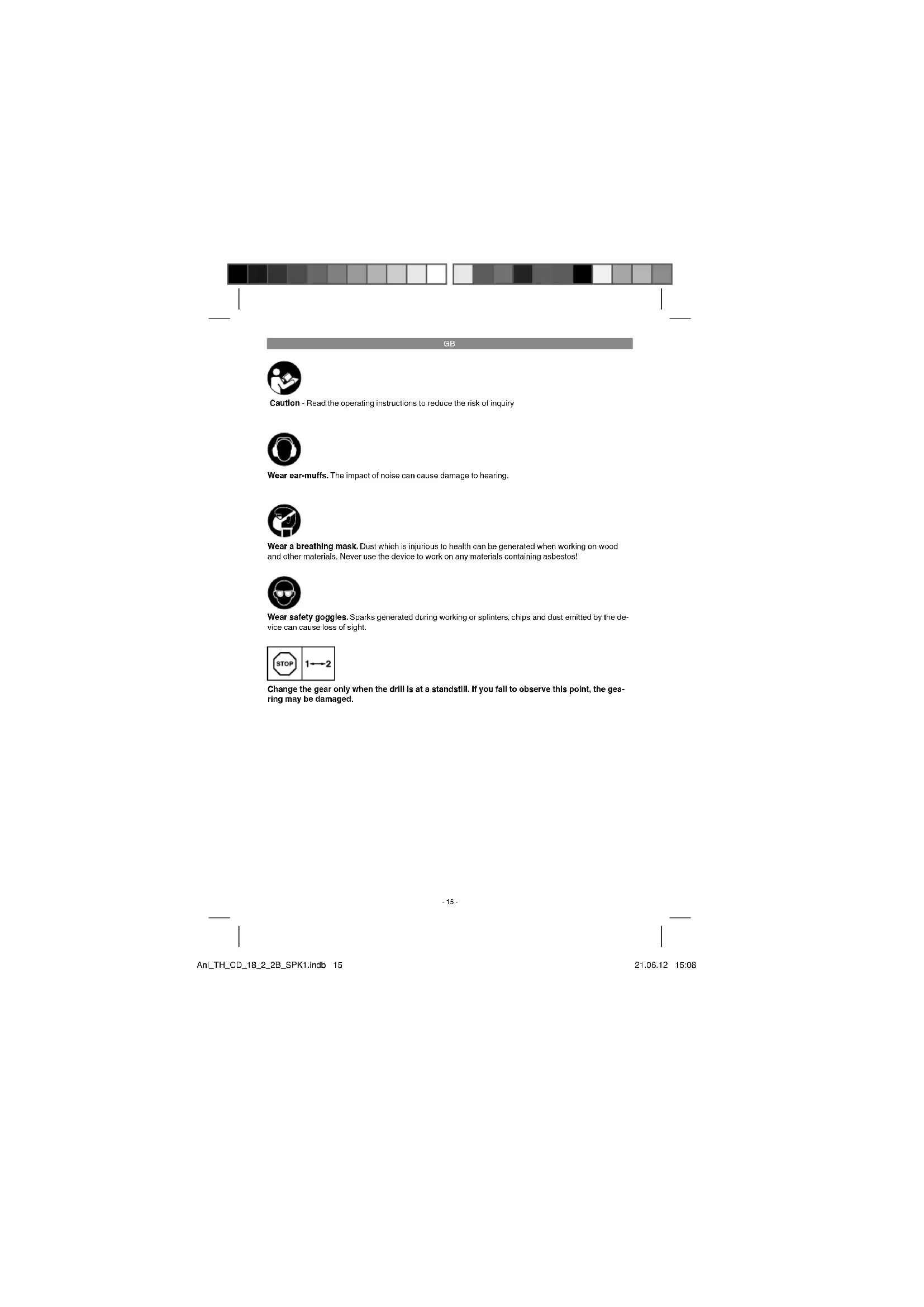 Caution - Read the operating instructions to reduce the risk of inquiry Wear ear-muff s. The impact of noise can cause damage to hearing. Wear safety goggles. Sparks generated during working or splinters, chips and dust emitted by the de- vice can cause loss of sight. Wear a breathing mask. Dust which is injurious to health can be generated when working on wood and other materials. Never use the device to work on any materials containing asbestos! Change the gear only when the drill is at a standstill. If you fail to observe this point, the gea- ring may be damaged. Anl_TH_CD_18_2_2B_SPK1.indb 15Anl_TH_CD_18_2_2B_SPK1.indb 15 21.06.12 15:0821.06.12 15:08GB