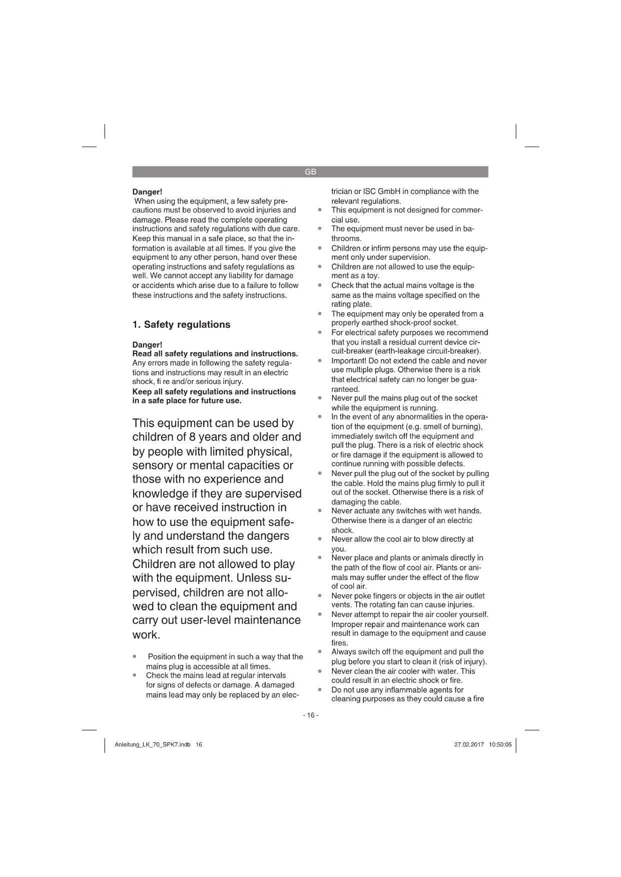 Danger! Read all safety regulations and instructions. Any errors made in following the safety regula- tions and instructions may result in an electric shock, fi re and/or serious injury. Keep all safety regulations and instructions in a safe place for future use. This equipment can be used by children of 8 years and older and by people with limited physical, sensory or mental capacities or those with no experience and knowledge if they are supervised or have received instruction in how to use the equipment safe- ly and understand the dangers which result from such use. Children are not allowed to play with the equipment. Unless su- pervised, children are not allo- wed to clean the equipment and carry out user-level maintenance work.
