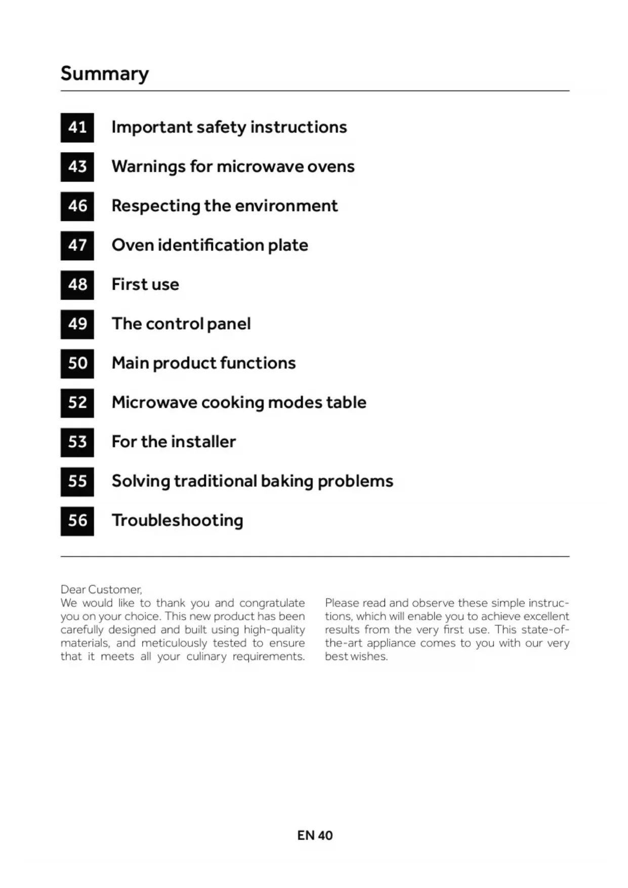 - If you see smoke coming out of the oven, turn o or unplug the appli- ance, and keep the door closed to extinguish any ames.EN 40 EN 41 Dear Customer, We would like to thank you and congratulate you on your choice. This new product has been carefully designed and built using high-quality materials, and meticulously tested to ensure that it meets all your culinary requirements. Please read and observe these simple instruc- tions, which will enable you to achieve excellent results from the very rst use. This state-of- the-art appliance comes to you with our very best wishes. Important safety instructions Warnings for microwave ovens Respecting the environment Oven identication plate First use The control panel Main product functions Microwave cooking modes table For the installer Solving traditional baking problems Troubleshooting