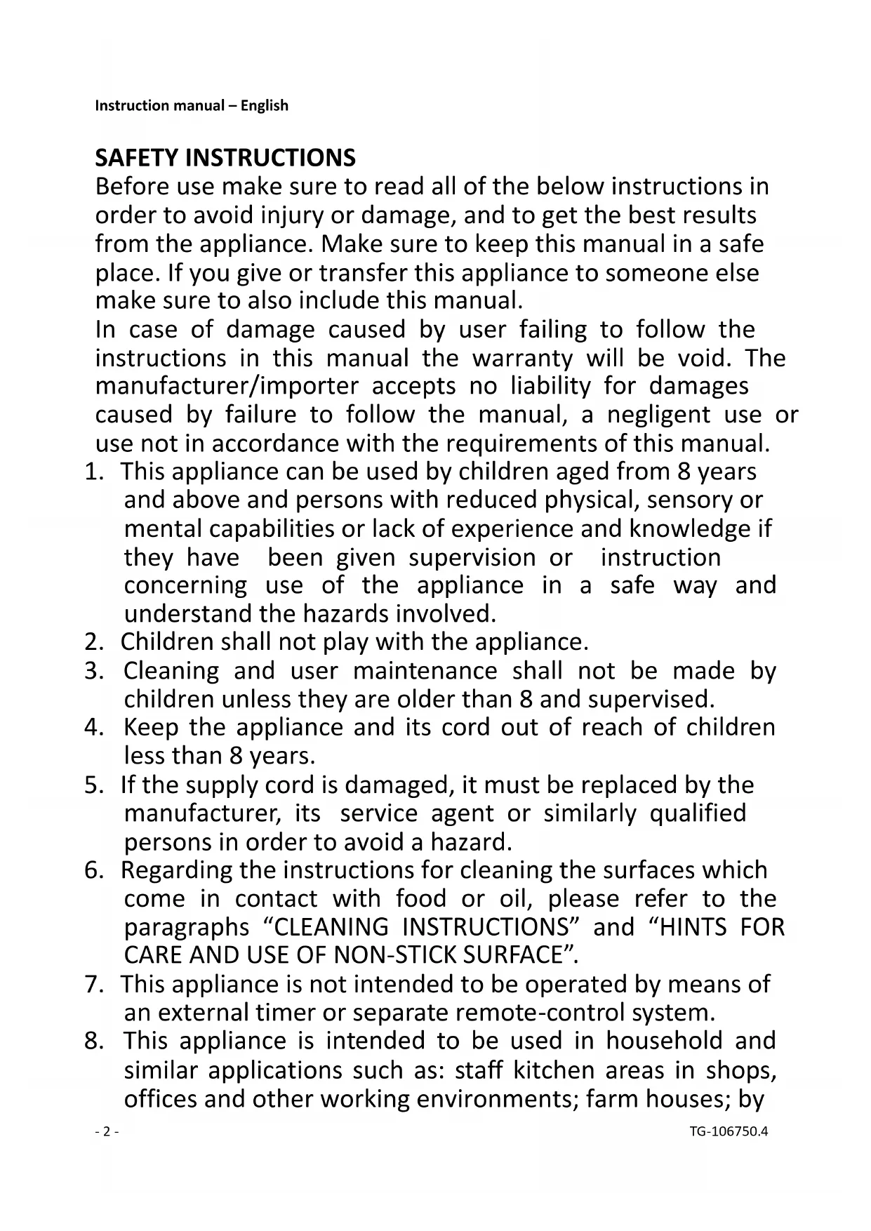 TG-106750.4 Teppanyaki grill (EN) Teppanyaki-Grill (DE) Plaque chauffante teppanyaki (FR) Teppanyaki griglia (IT)- 1 - TG-106750.4 Content – Inhalt – Contenu – Contenuto Instruction manual – English ...................................................................................... - 2 - Bedienungsanleitung – Deutsch ................................................................................. - 7 - Mode d’emploi – Français ........................................................................................ - 12 - Manuale d'istruzioni – Italiano ................................................................................. - 17 -- 2 - TG-106750.4 Instruction manual – English SAFETY INSTRUCTIONS Before use make sure to read all of the below instructions in order to avoid injury or damage, and to get the best results from the appliance. Make sure to keep this manual in a safe place. If you give or transfer this appliance to someone else make sure to also include this manual. In case of damage caused by user failing to follow the instructions in this manual the warranty will be void. The manufacturer/importer accepts no liability for damages caused by failure to follow the manual, a negligent use or use not in accordance with the requirements of this manual.