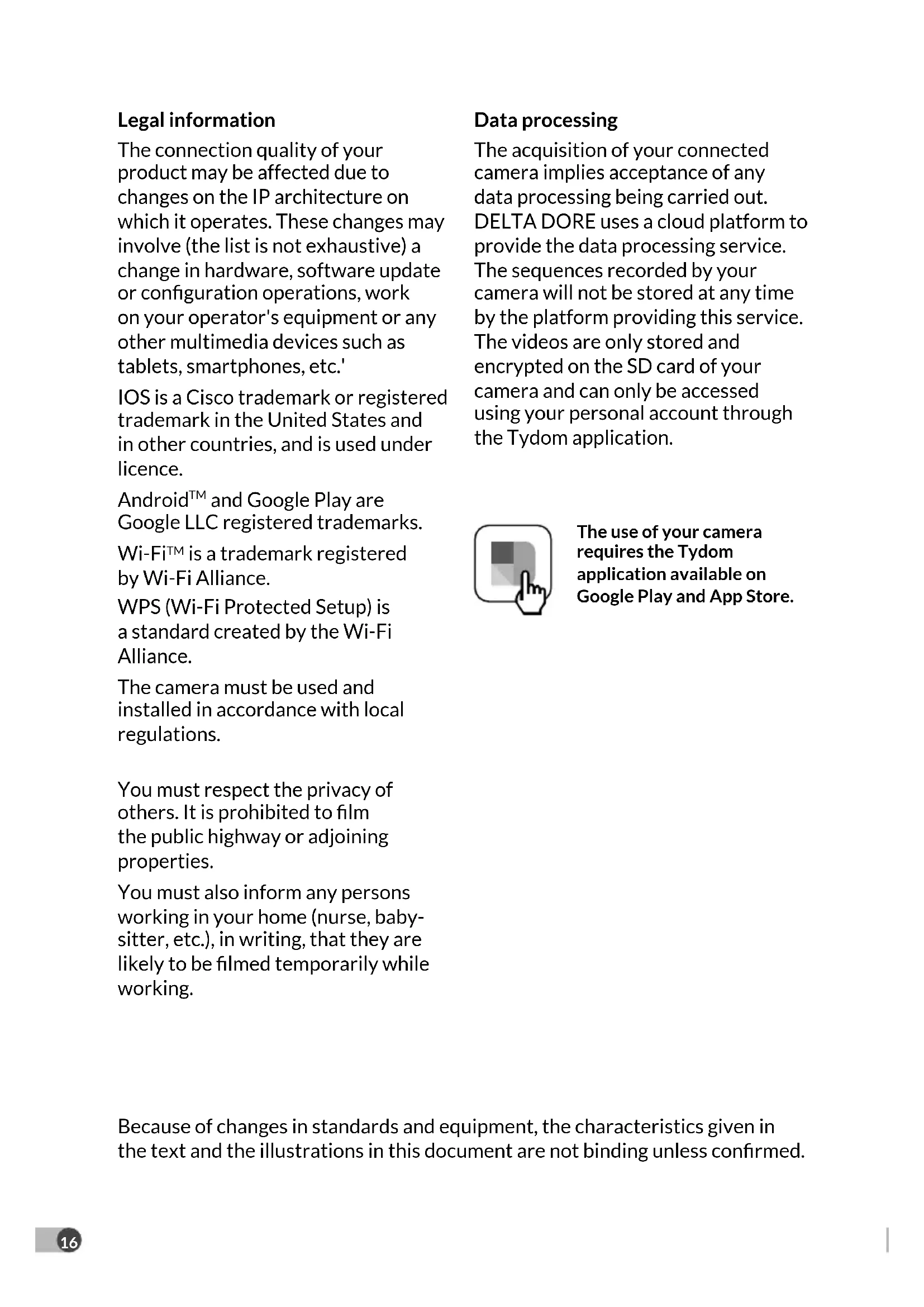 is a trademark registered by Wi-Fi Alliance. WPS (Wi-Fi Protected Setup) is a standard created by the Wi-Fi Alliance. The camera must be used and installed in accordance with local regulations. You must respect the privacy of others. It is prohibited to lm the public highway or adjoining properties. You must also inform any persons working in your home (nurse, baby- sitter, etc.), in writing, that they are likely to be lmed temporarily while working. Data processing The acquisition of your connected camera implies acceptance of any data processing being carried out. DELTA DORE uses a cloud platform to provide the data processing service. The sequences recorded by your camera will not be stored at any time by the platform providing this service. The videos are only stored and encrypted on the SD card of your camera and can only be accessed using your personal account through the Tydom application. The use of your camera requires the Tydom application available on Google Play and App Store. Because of changes in standards and equipment, the characteristics given in the text and the illustrations in this document are not binding unless conrmed.17