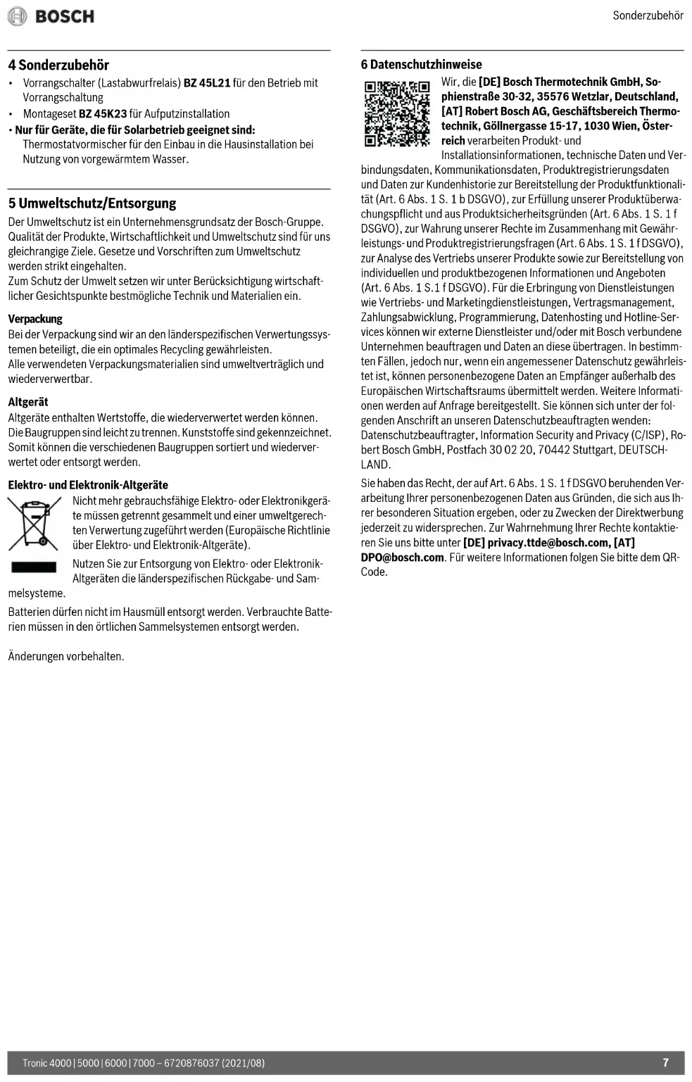 - Only for appliances that are suitable for solar heating systems: Thermostatic premixer for installation in the domestic plumbing when using preheated water 5 Environmental protection/disposal Environmental protection is a fundamental corporate strategy of the Bosch Group. The quality of our products, their economy and environmental safety are all of equal importance to us and all environmental protection legislation and regulations are strictly observed. We use the best possible technology and materials for protecting the environment taking account of economic considerations. Packaging Where packaging is concerned, we participate in country-specific recycling processes that ensure optimum recycling. All of our packaging materials are environmentally compatible and can be recycled. Used appliances Used appliances contain valuable materials that can be recycled. The various assemblies can be easily dismantled. Synthetic materials are marked accordingly. Assemblies can therefore be sorted by composition and passed on for recycling or disposal. Used electrical and electronic appliances Electrical or electronic devices that are no longer serviceable must be collected separately and sent for environmentally compatible recycling (in accordance with the European Waste Electrical and Electronic Equipment Directive). To dispose of old electrical or electronic devices, you should use the return and collection systems put in place in the country concerned. Batteries must not be disposed together with your household waste. Used batteries must be disposed of in local collection systems. 6 Data Protection Notice We, Bosch Thermotechnology Ltd., Cotswold Way, Warndon, Worcester WR4 9SW, United Kingdom process product and installation information, technical and connection data, communication data, product registration and client history data to provide product functionality (art. 6 (1) sentence 1 (b) GDPR), to fulfil our duty of product surveillance and for product safety and security reasons (art. 6 (1) sentence 1 (f) GDPR), to safeguard our rights in connection with warranty and product registration questions (art. 6 (1) sentence 1 (f) GDPR) and to analyze the distribution of our products and to provide individualized information and offers related to the product (art. 6 (1) sentence 1 (f) GDPR). To provide services such as sales and marketing services, contract management, payment handling, programming, data hosting and hotline services we can commission and transfer data to external service providers and/or Bosch affiliated enterprises. In some cases, but only if appropriate data protection is ensured, personal data might be transferred to recipients located outside of the European Economic Area. Further information are provided on request. You can contact our Data Protection Officer under: Data Protection Officer, Information Security and Privacy (C/ISP), Robert Bosch GmbH, Postfach 30 02 20, 70442 Stuttgart, GERMANY. You have the right to object, on grounds relating to your particular situation or where personal data are processed for direct marketing purposes, at any time to processing of your personal data which is based on art. 6 (1) sentence 1 (f) GDPR. To exercise your rights, please contact us via privacy.ttgb@bosch.com To find further information, please follow the QR-Code.Table des matières Tronic 4000 | 5000 | 6000 | 7000 – 6720876037 (2021/08)
