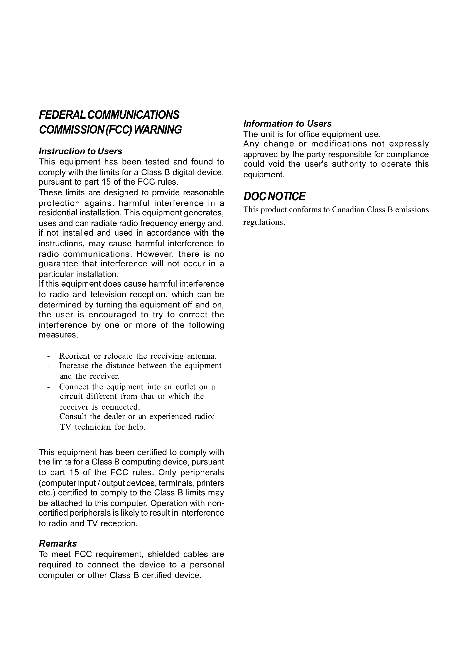 Information to Users The unit is for office equipment use. Any change or modifications not expressly approved by the party responsible for compliance could void the user's authority to operate this equipment. DOC NOTICE This product conforms to Canadian Class B emissions regulations. FEDERAL COMMUNICATIONS