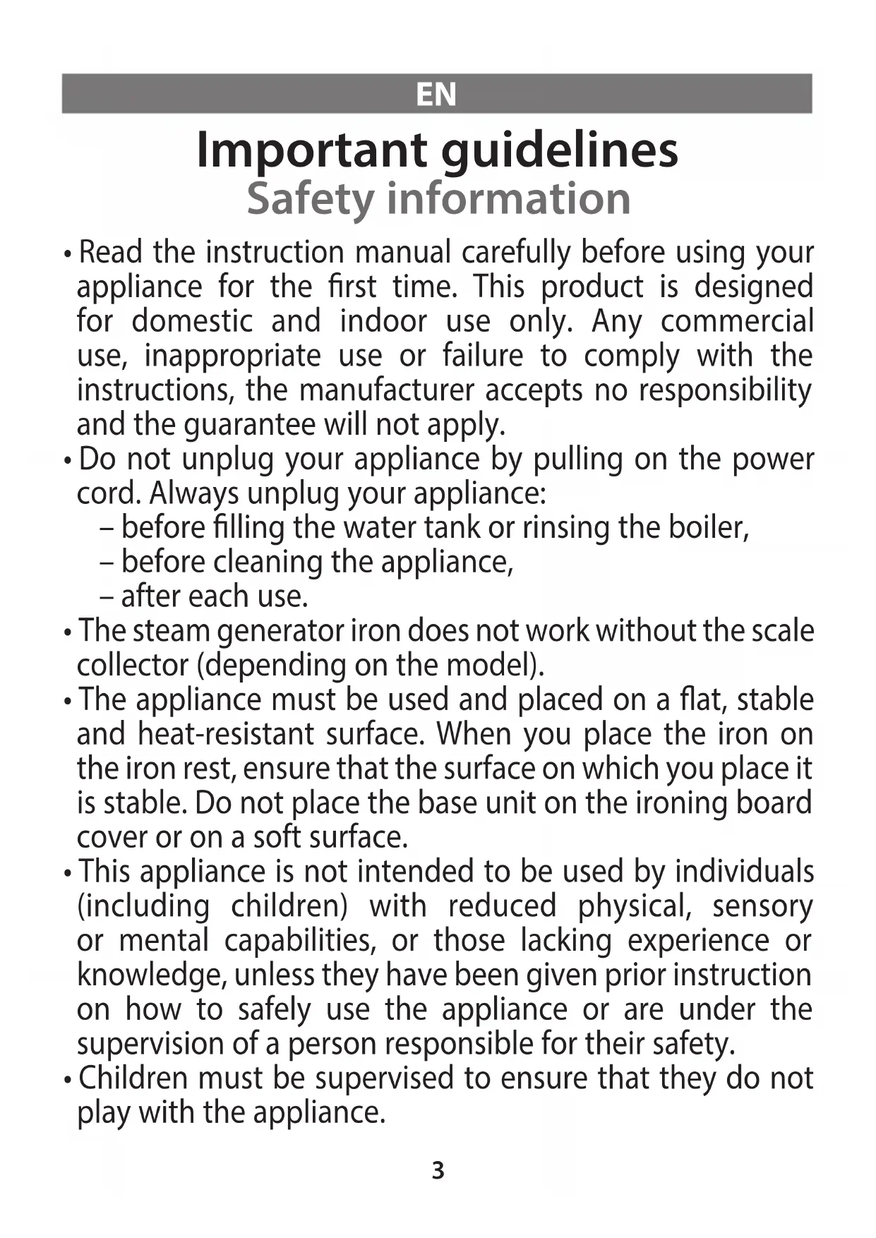 - The steam generator iron does not work without the scale collector (depending on the model).
