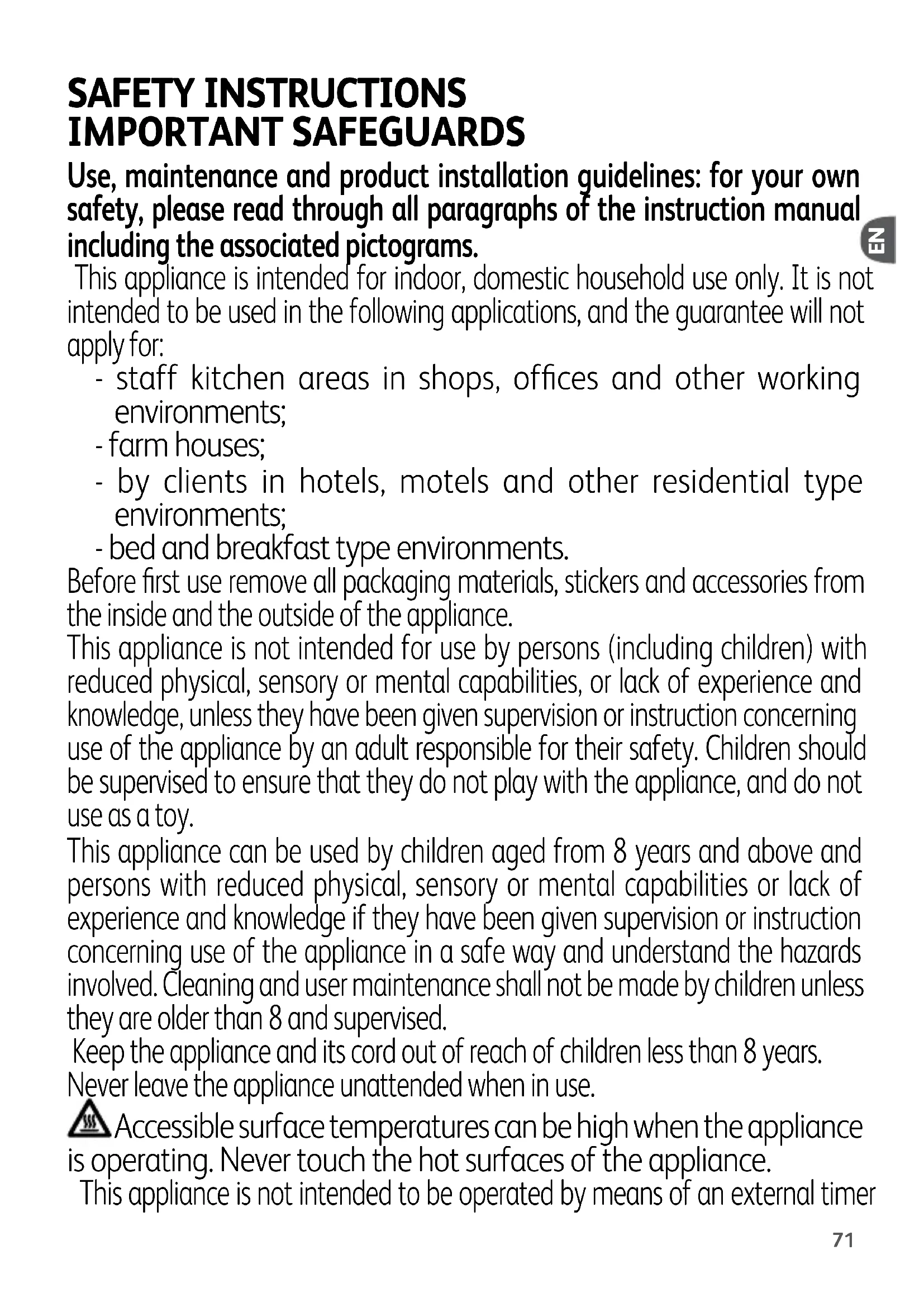 SAFETY INSTRUCTIONS IMPORTANT SAFEGUARDS Use, maintenance and product installation guidelines: for your own safety, please read through all paragraphs of the instruction manual including the associated pictograms. This appliance is intended for indoor, domestic household use only. It is not intended to be used in the following applications, and the guarantee will not apply for: - staff kitchen areas in shops, offices and other working environments; - farm houses; - by clients in hotels, motels and other residential type environments; - bed and breakfast type environments. Before first use remove all packaging materials, stickers and accessories from the inside and the outside of the appliance. This appliance is not intended for use by persons (including children) with reduced physical, sensory or mental capabilities, or lack of experience and knowledge, unless they have been given supervision or instruction concerning use of the appliance by an adult responsible for their safety. Children should be supervised to ensure that they do not play with the appliance, and do not use as a toy. This appliance can be used by children aged from 8 years and above and persons with reduced physical, sensory or mental capabilities or lack of experience and knowledge if they have been given supervision or instruction concerning use of the appliance in a safe way and understand the hazards involved. Cleaning and user maintenance shall not be made by children unless they are older than 8 and supervised. Keep the appliance and its cord out of reach of children less than 8 years. Never leave the appliance unattended when in use.