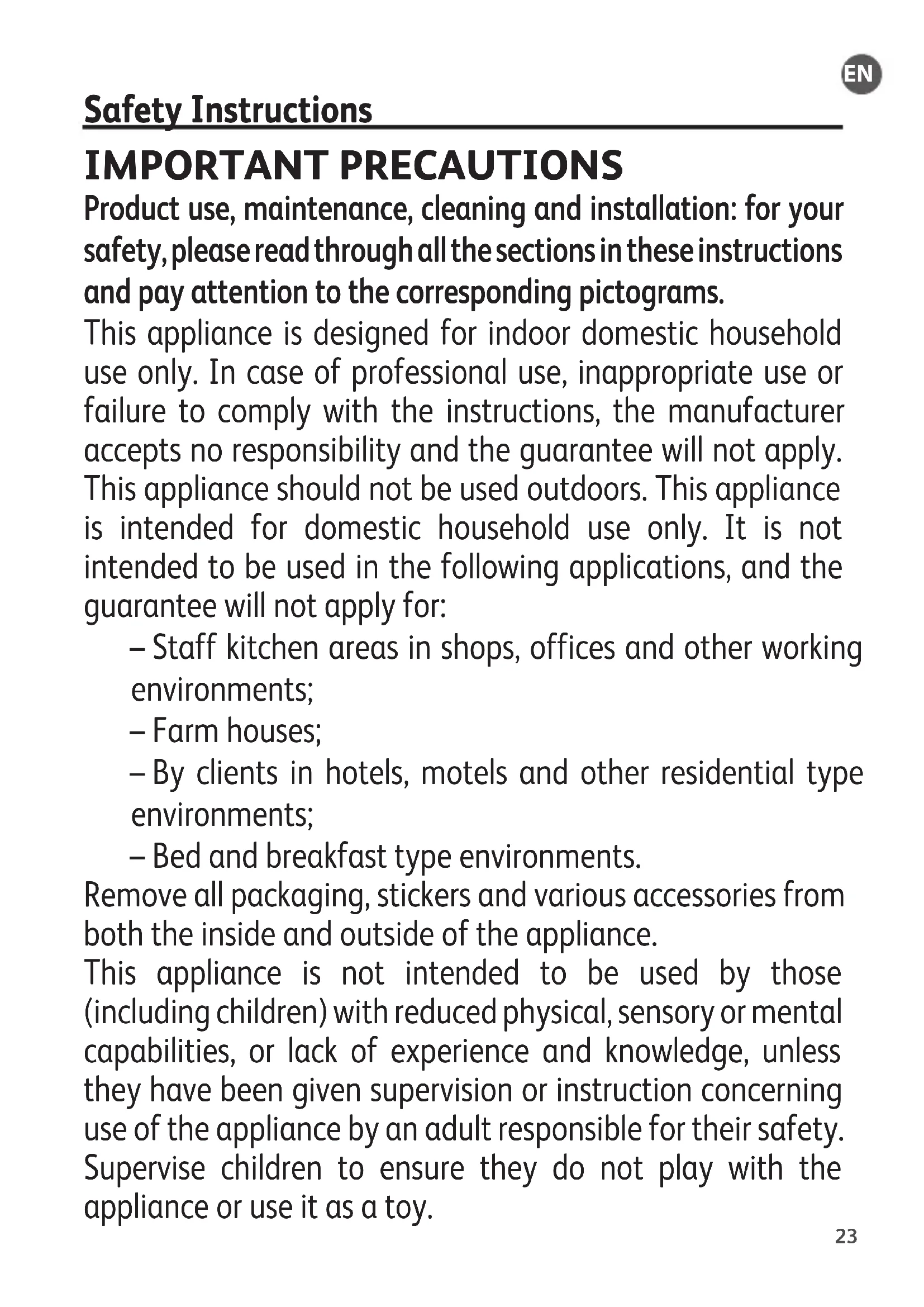 ENSafety Instructions IMPORTANT PRECAUTIONS Product use, maintenance, cleaning and installation: for your safety, please read through all the sections in these instructions and pay attention to the corresponding pictograms. This appliance is designed for indoor domestic household use only. In case of professional use, inappropriate use or failure to comply with the instructions, the manufacturer accepts no responsibility and the guarantee will not apply. This appliance should not be used outdoors. This appliance is intended for domestic household use only. It is not intended to be used in the following applications, and the guarantee will not apply for: – Staff kitchen areas in shops, offices and other working environments; – Farm houses; – By clients in hotels, motels and other residential type environments; – Bed and breakfast type environments. Remove all packaging, stickers and various accessories from both the inside and outside of the appliance. This appliance is not intended to be used by those (including children) with reduced physical, sensory or mental capabilities, or lack of experience and knowledge, unless they have been given supervision or instruction concerning use of the appliance by an adult responsible for their safety. Supervise children to ensure they do not play with the appliance or use it as a toy.