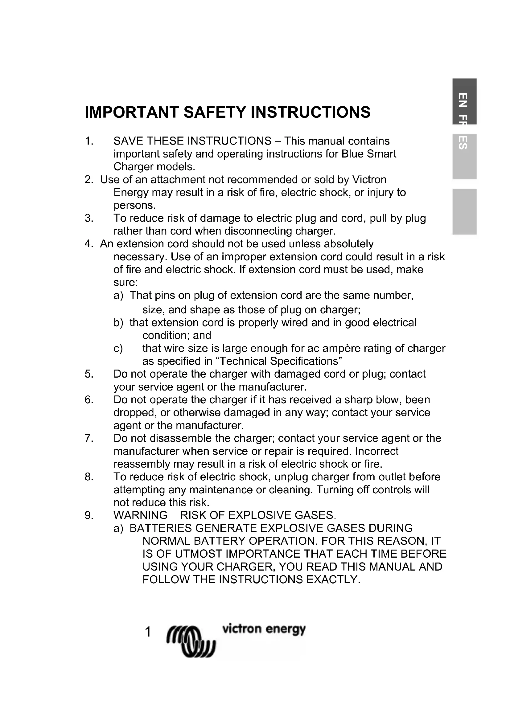120 V AC-connection Cable of 1.8 meter (6 feet) with US NEMA 5-15 plug Protection category IP67 Weight 12/7, 12/13, 24/5: 1.8kg (4lbs) 12/17, 12/25, 24/8, 24/12: 2.4kg (5.3lbs) Dimensions (h x w x d) 12/7, 12/13, 24/5: 85 x 211 x 60 mm 3.4 x 8.3 x 2.4 inches 12/17, 12/25, 24/8, 24/12: 99 x 219 x 65 mm 3.9 x 8.6 x 2.6 inches STANDARDS Safety EN 60335-1, EN 60335-2-29 (UL1236 / CSA C22.2) Emission EN 55014-1, EN 61000-3-2 Immunity EN 55014-2, EN 61000-3-31 EN FR ES Compliance Statement This device complies with part 15 of the FCC rules. Operation is subject to the following two conditions. (1) This device may not cause harmful interference. (2) This device must accept any interference received, including interference that may cause undesired operation.” This device complies with Industry Canada license exempt RSS Standard(s). Operation is subject to the following two conditions. (1) This device may not cause harmful interference. (2) This device must accept any interference received, including interference that may cause undesired operation. Contain FCC ID: SH6MDBT40 Contain IC ID: 8017A MDBT40 Frequency range: 2402 – 2480 MHz Transmit power: -4dBm Maintenance The Blue Smart Charger is maintenance free. When cleaning the charger remove the plug from the power socket. Then use a damp cloth to clean the exterior. Five year limited warranty This limited warranty covers defects in materials and workmanship in this product, and lasts for five years from the date of original purchase of this product. The customer must return the product together with the receipt of purchase to the point of purchase. This limited warranty does not cover damage, deterioration or malfunction resulting from alteration, modification, improper or unreasonable use or misuse, neglect, exposure to excess moisture, fire, improper packing, lightning, power surges, or other acts of nature. This limited warranty does not cover damage, deterioration or malfunction resulting from repairs attempted by anyone unauthorized by Victron Energy to make such repairs. Victron Energy is not liable for any consequential damages arising from the use of this product. The maximum liability of Victron Energy under this limited warranty shall not exceed the actual purchase price of the product.2
