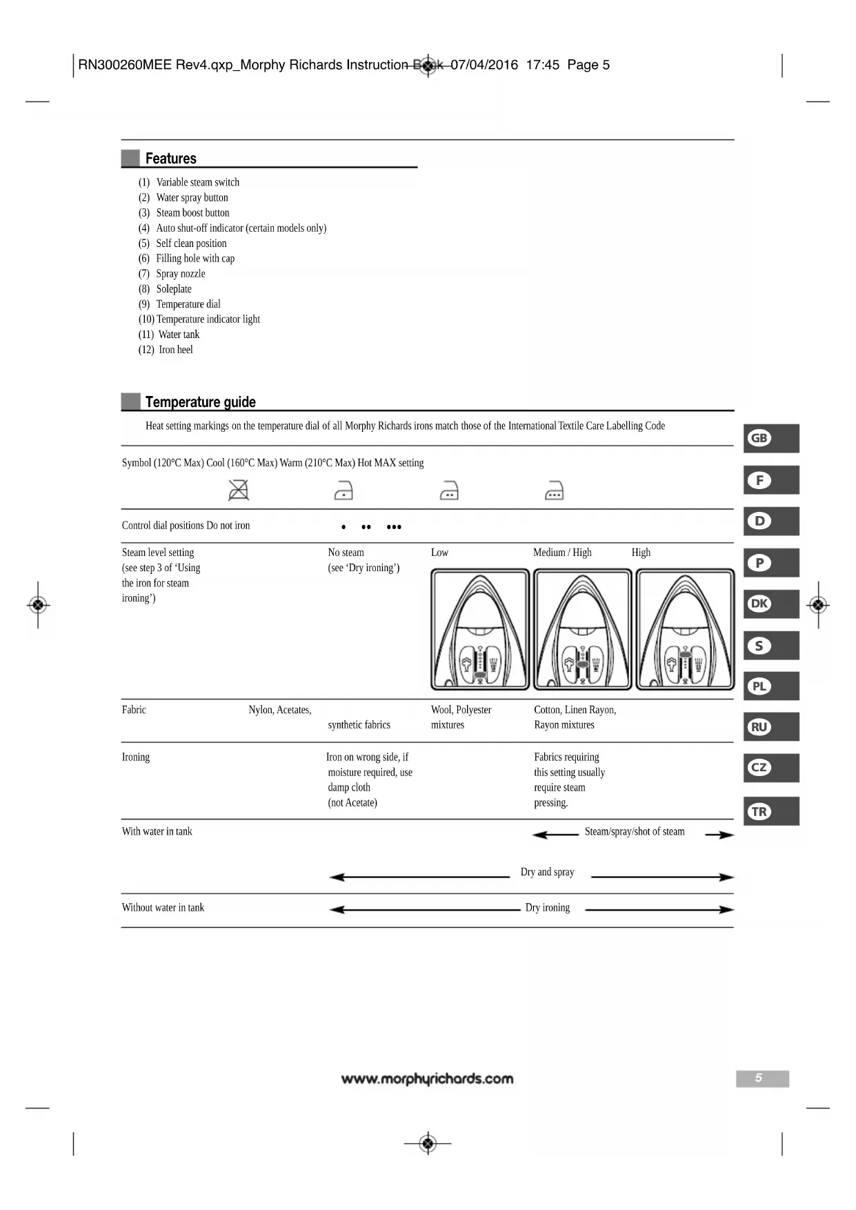 Fabric Nylon, Acetates, synthetic fabrics Wool, Polyester mixtures Cotton, Linen Rayon, Rayon mixtures Ironing Iron on wrong side, if moisture required, use damp cloth (not Acetate) Fabrics requiring this setting usually require steam pressing. Steam level setting (see step 3 of ‘Using the iron for steam ironing’) No steam (see ‘Dry ironing’) Low Medium / High High With water in tank Dry and spray Steam/spray/shot of steam Without water in tank Dry ironing Temperature guide Heat setting markings on the temperature dial of all Morphy Richards irons match those of the International Textile Care Labelling Code RN300260MEE Rev4.qxp_Morphy Richards Instruction Book 07/04/2016 17:45 Page 5Before use Remove any protective cover from the soleplate (8). Using the iron for steam ironing