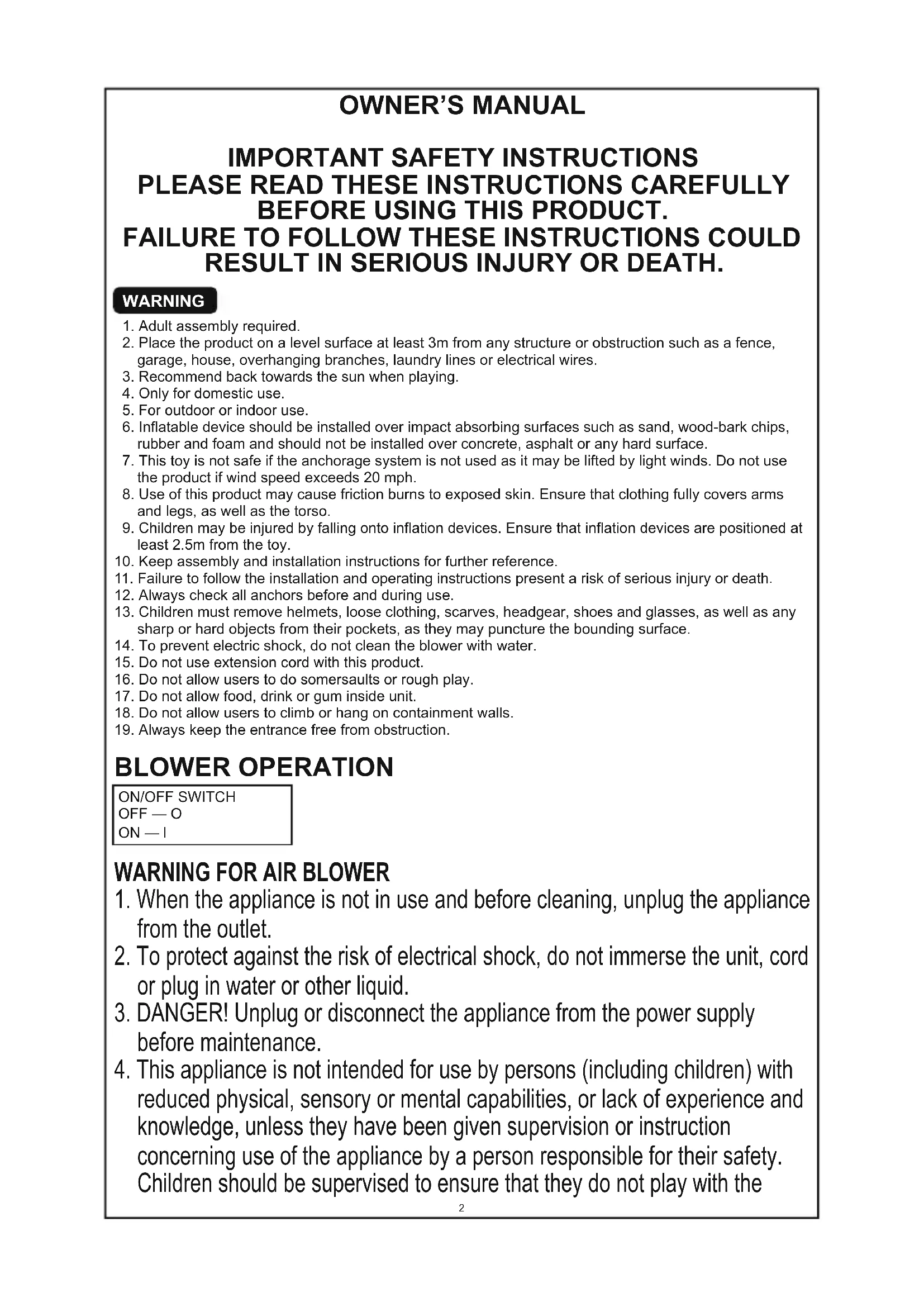 reduce tripping and tipping hazards. Attention: After inflation, the blower should run continuously while children are playing.