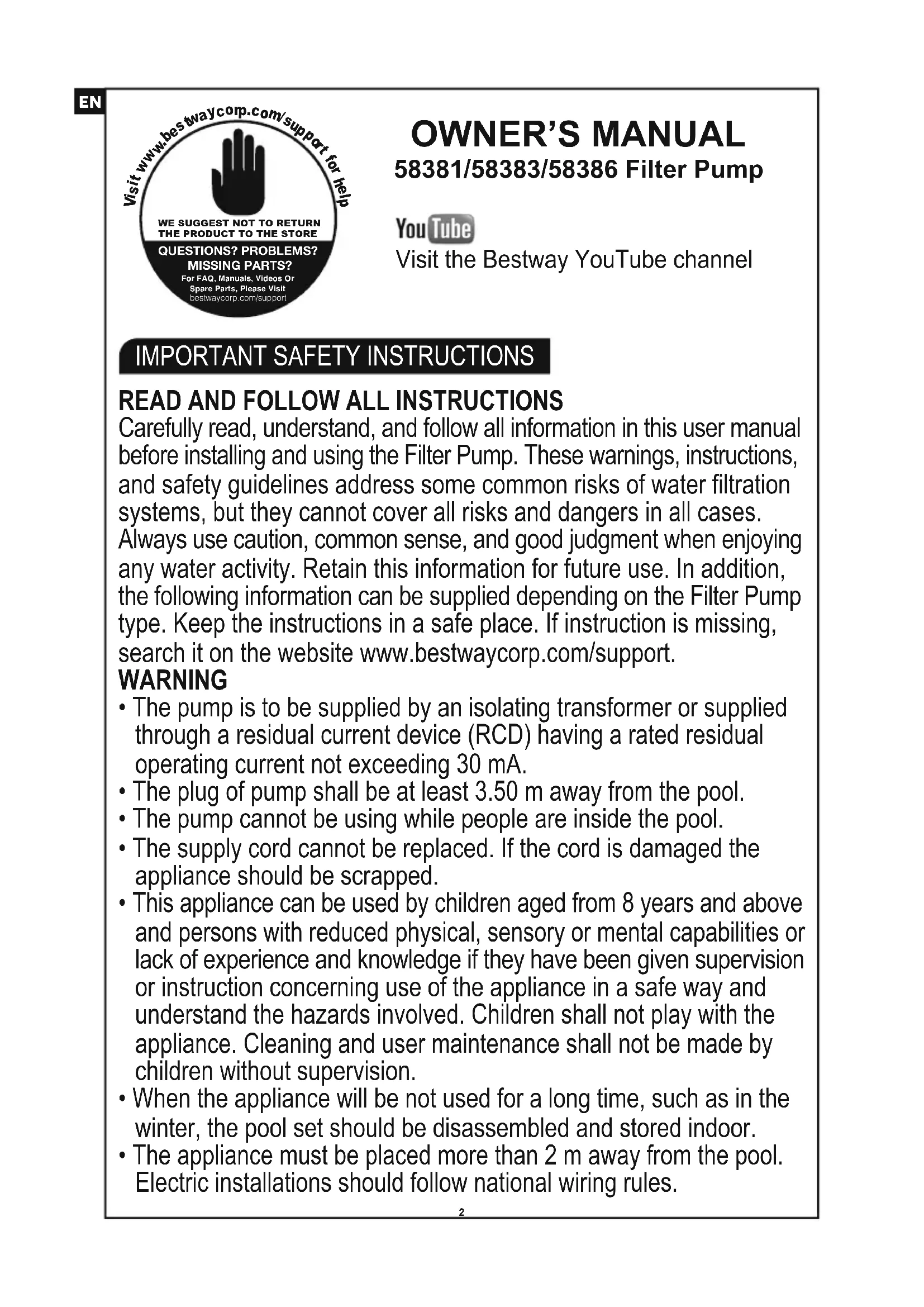 Carefully read, understand, and follow all information in this user manual before installing and using the Filter Pump. These warnings, instructions, and safety guidelines address some common risks of water filtration systems, but they cannot cover all risks and dangers in all cases. Always use caution, common sense, and good judgment when enjoying any water activity. Retain this information for future use. In addition, the following information can be supplied depending on the Filter Pump type. Keep the instructions in a safe place. If instruction is missing, search it on the website www.bestwaycorp.com/support. WARNING